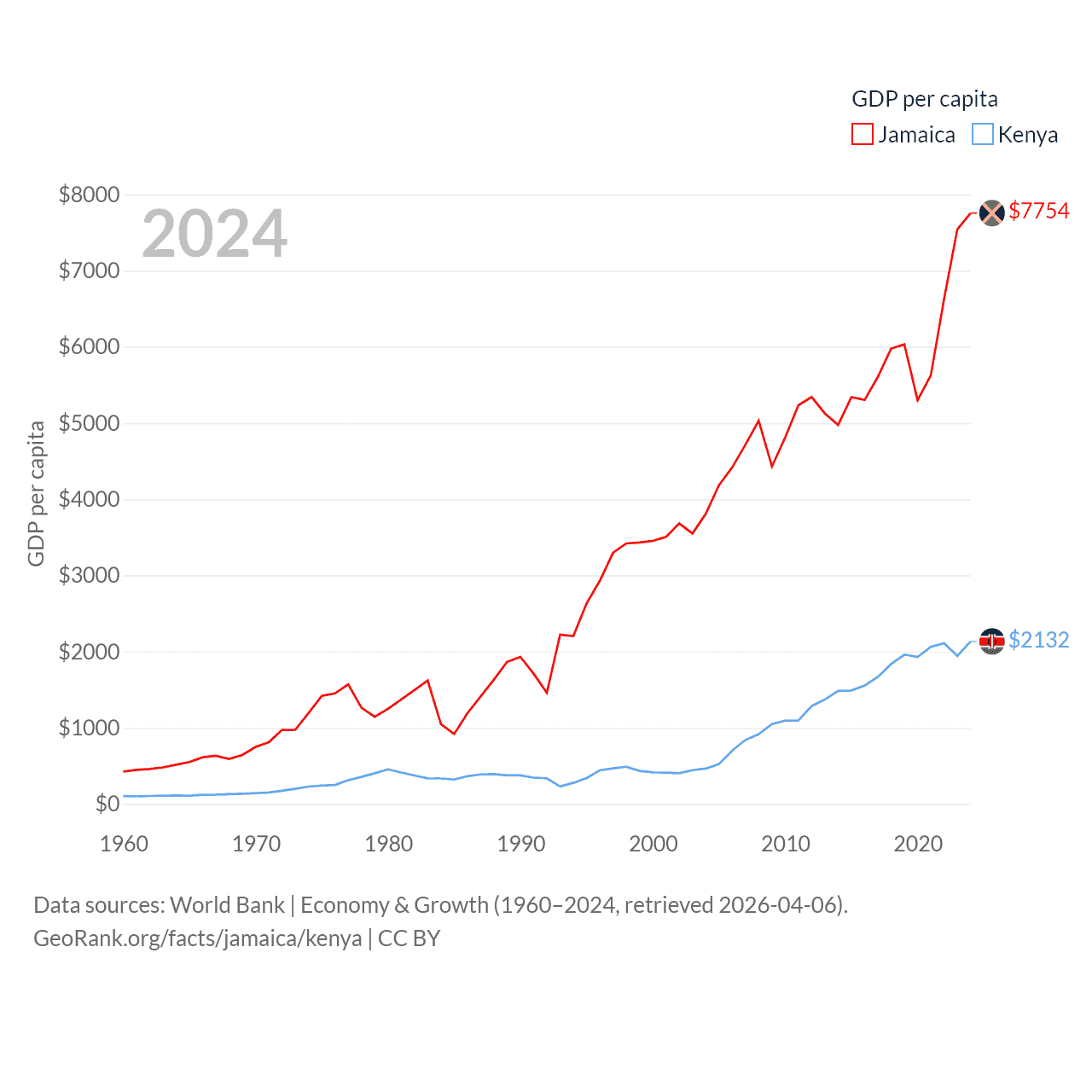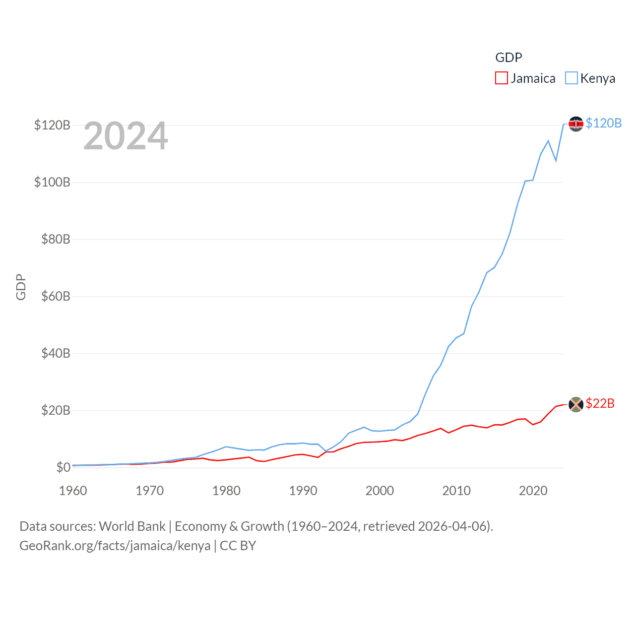 By GDP, Jamaica ranks 124/197 ($22B) and Kenya ranks 64/197 ($120B). By GDP per capita, Jamaica ranks 95/197 ($7,754), while Kenya ranks 154/197 ($2,132).