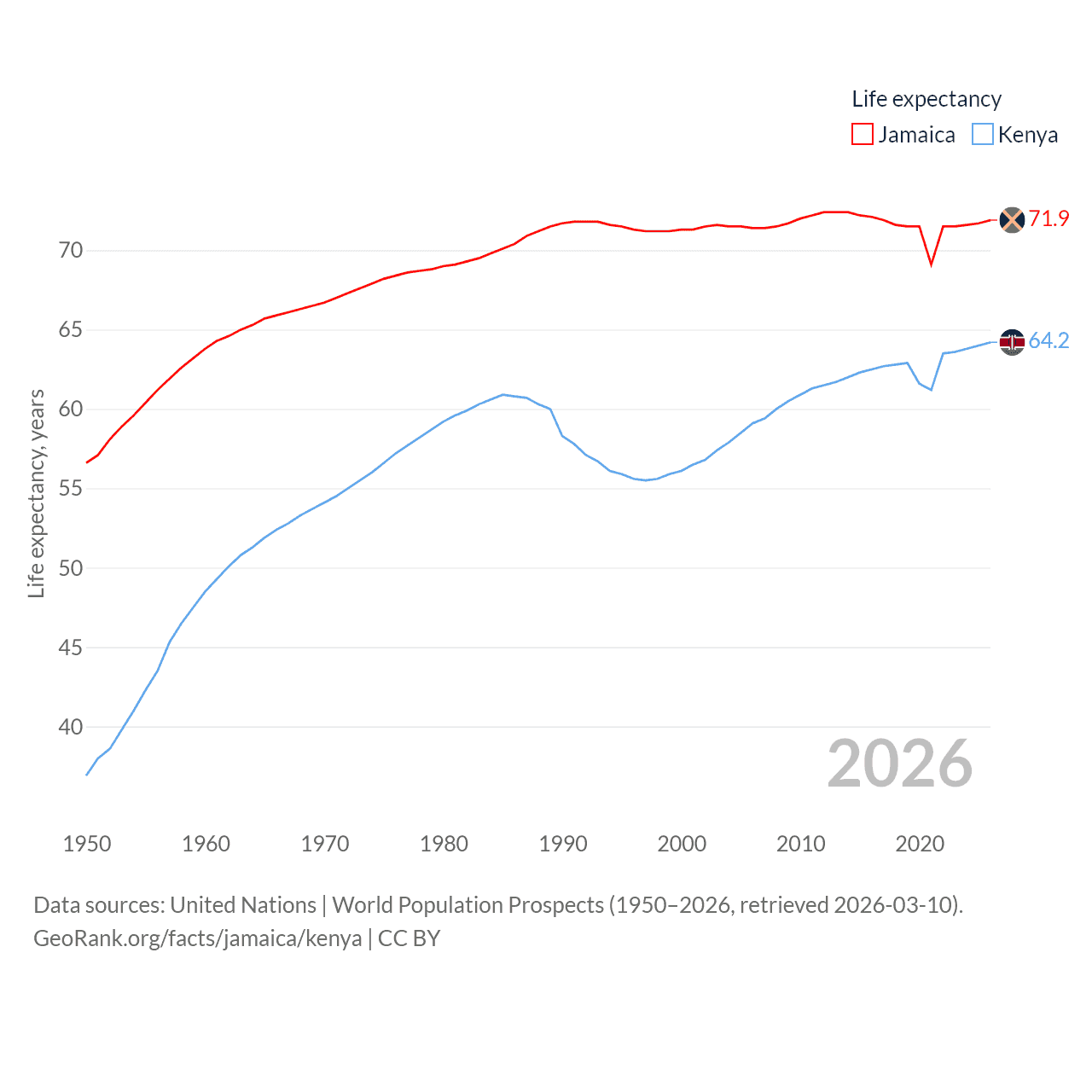 Jamaica has a population of 2.84M (ranked 139/197), compared with 56.4M in Kenya (ranked 26/197). Jamaica's land area is 4,181 sq mi versus 224,278 sq mi for Kenya (ranked 159th vs. 45th).
