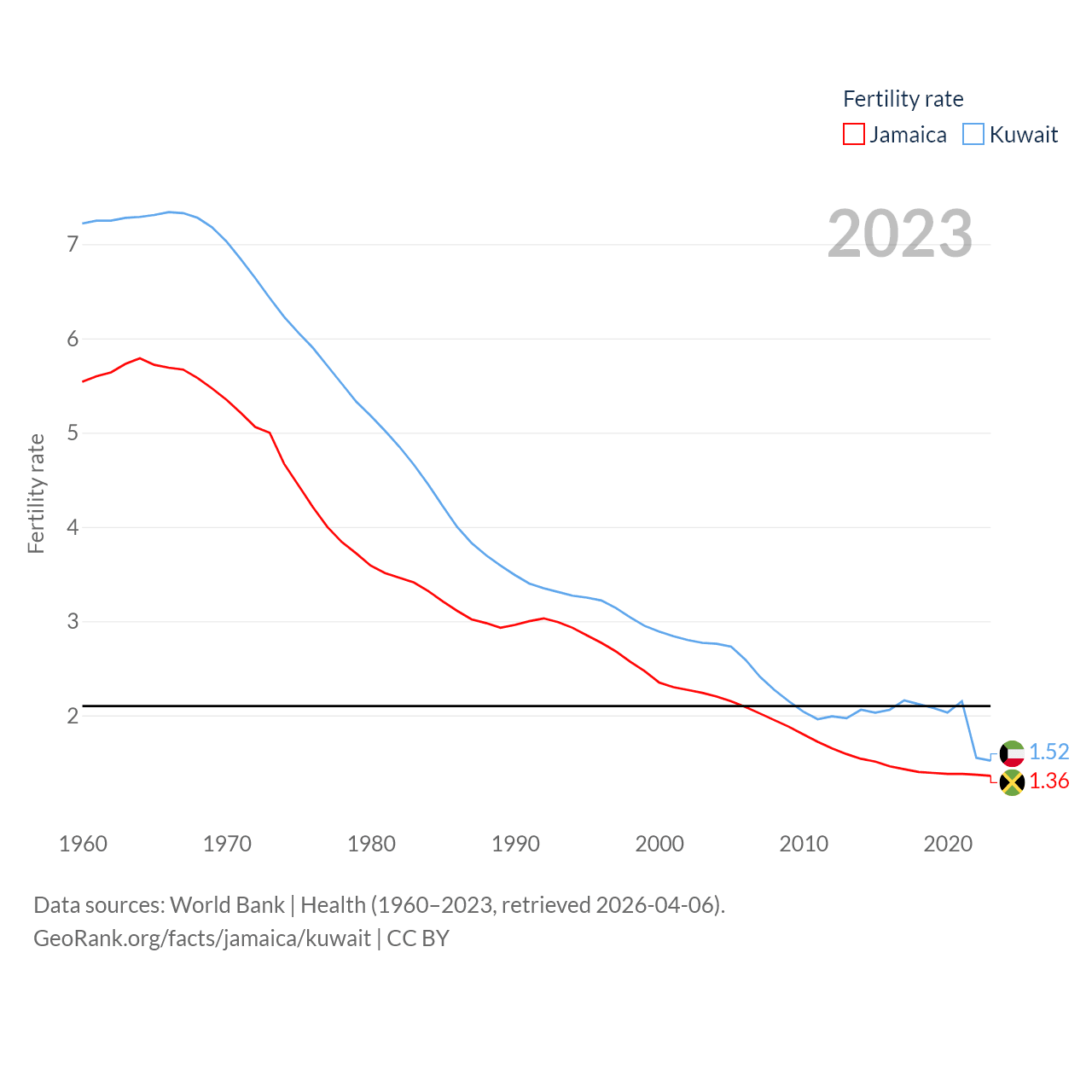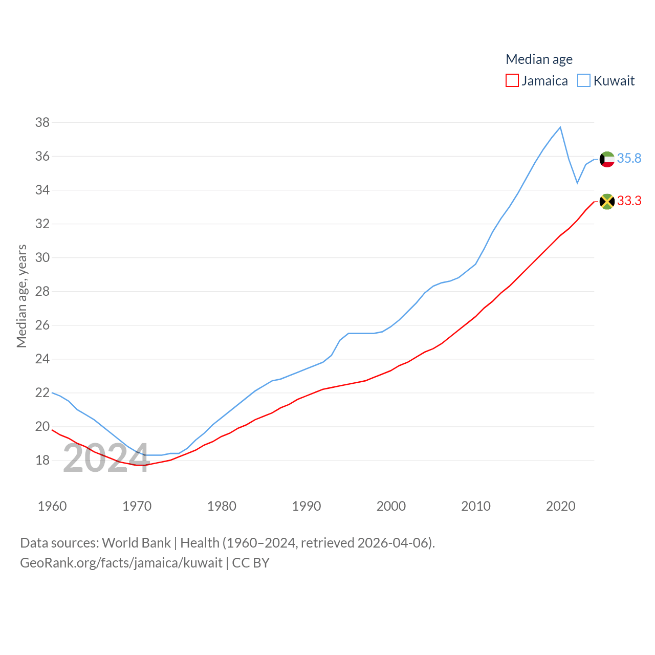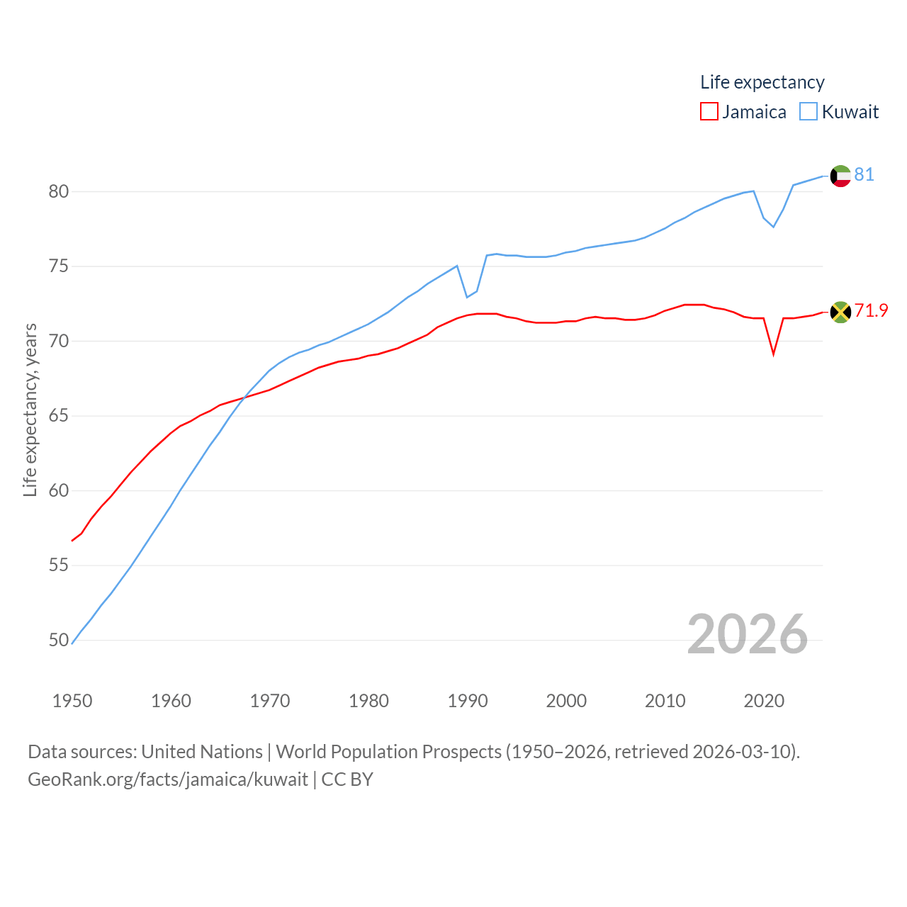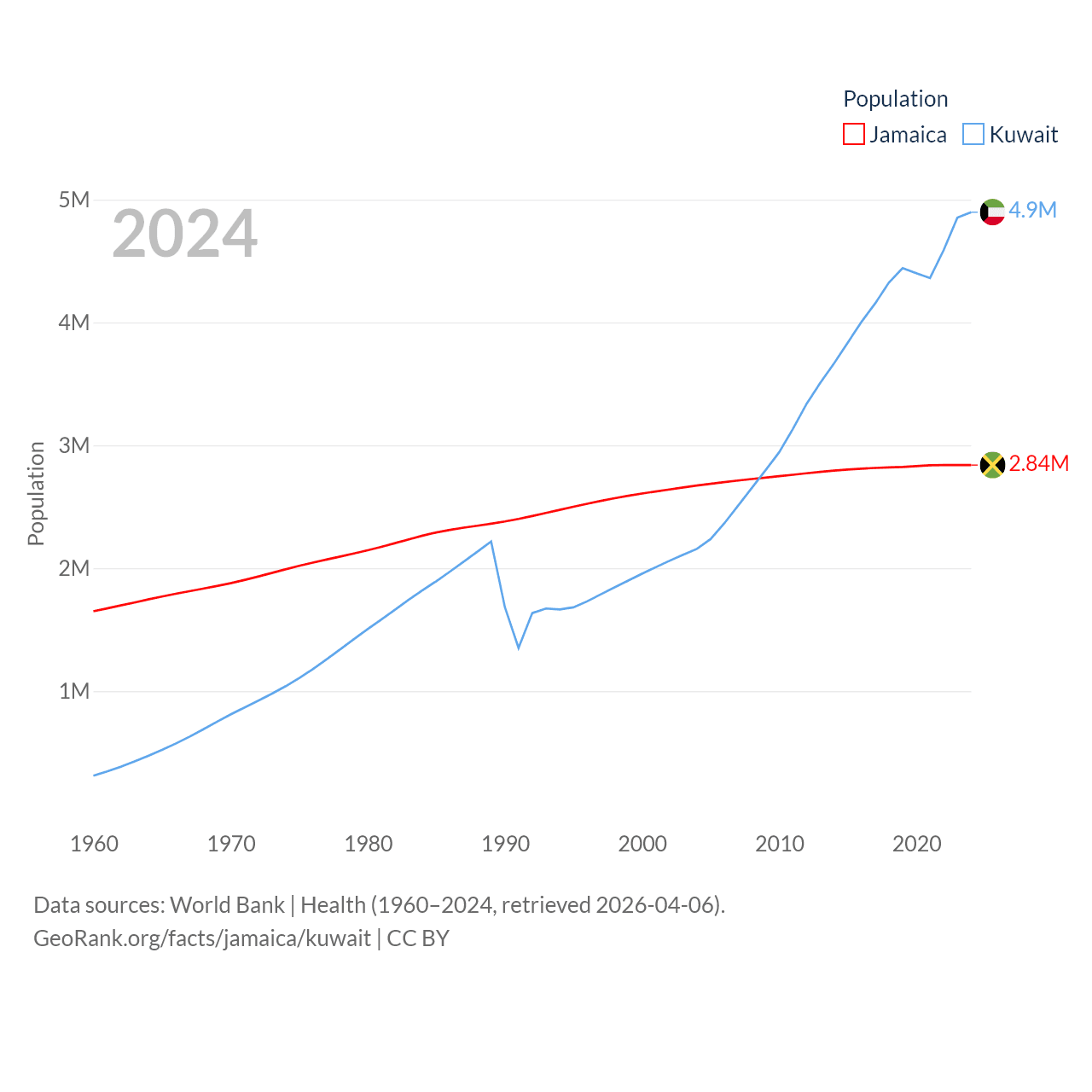 Jamaica has a population of 2.84M (ranked 139/197), compared with 4.9M in Kuwait (ranked 127/197). Jamaica's land area is 4,181 sq mi versus 6,880 sq mi for Kuwait (ranked 159th vs. 153rd).