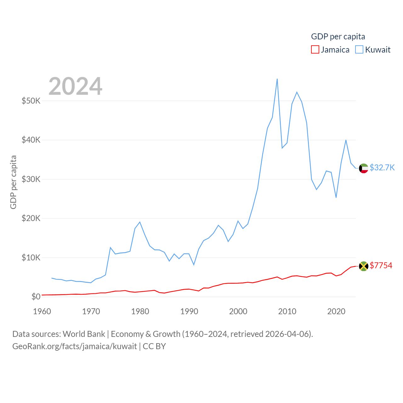 By GDP, Jamaica ranks 124/197 ($22B) and Kuwait ranks 59/197 ($160B). By GDP per capita, Jamaica ranks 95/197 ($7,754), while Kuwait ranks 37/197 ($32,718).