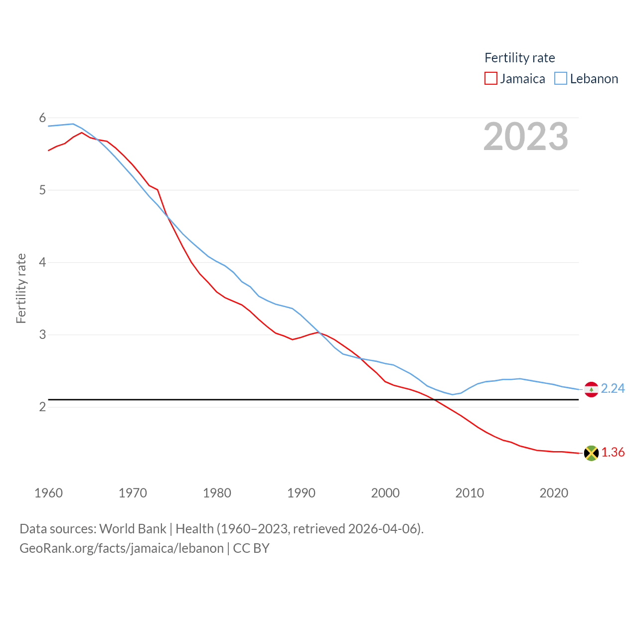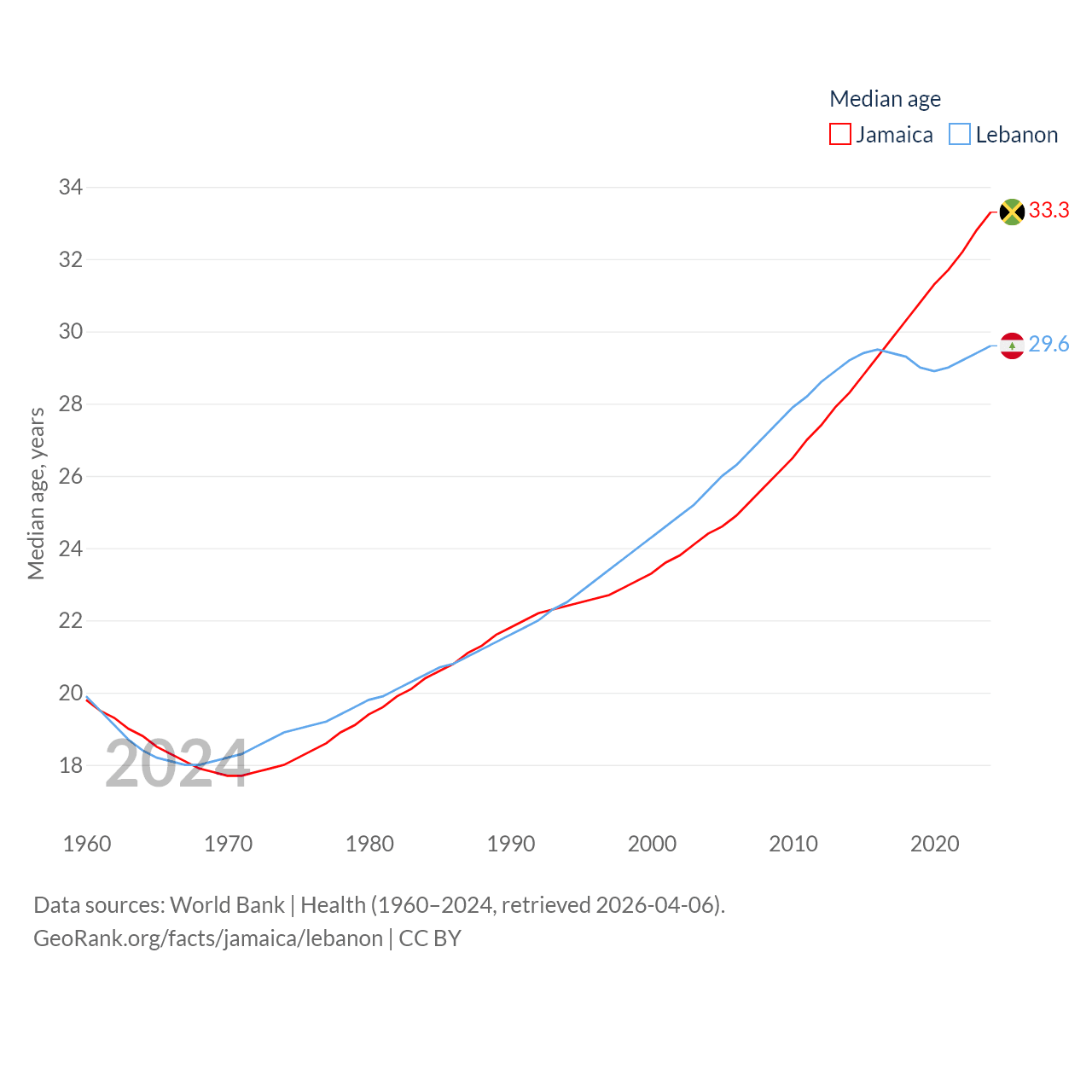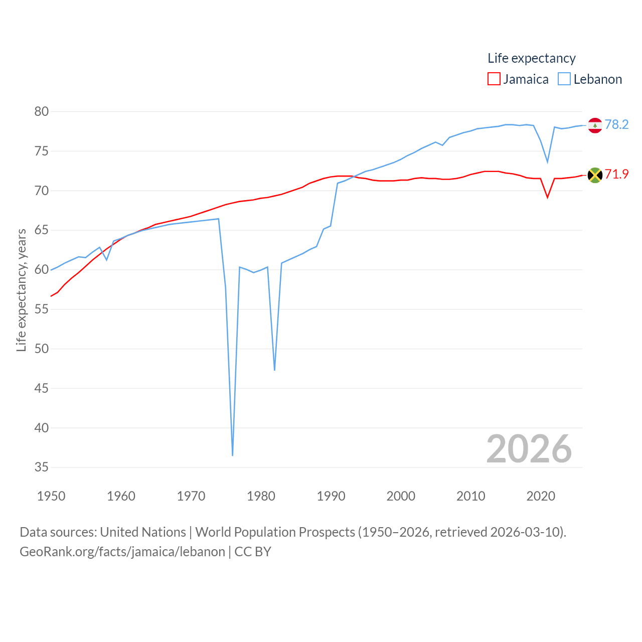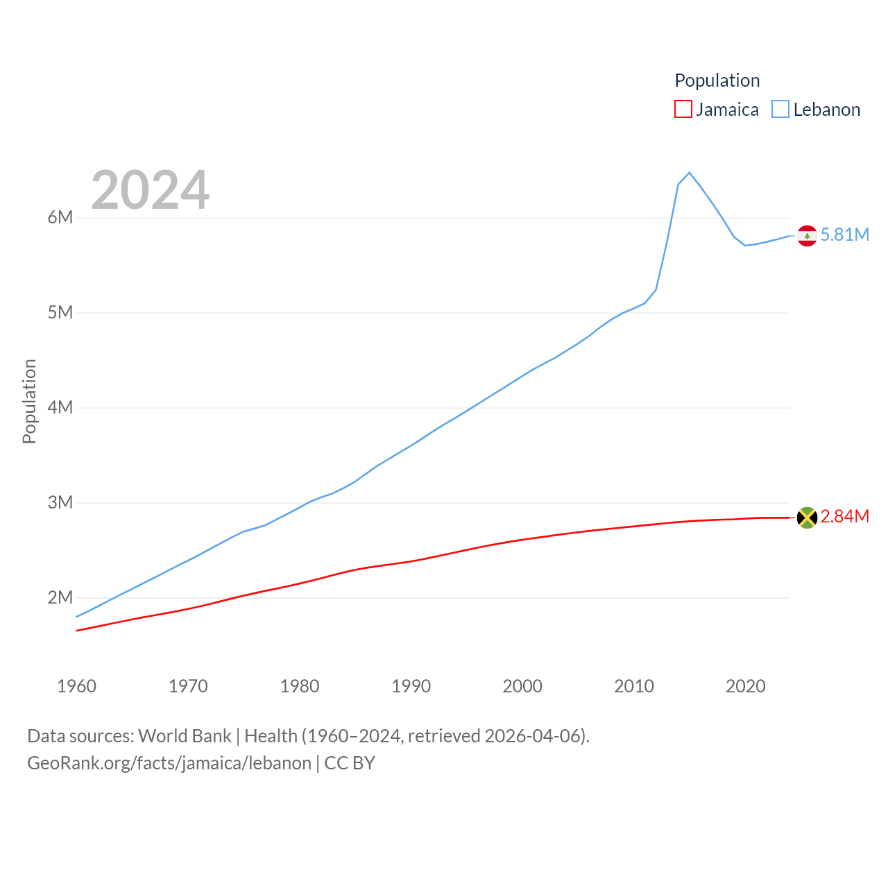 Jamaica has a population of 2.84M (ranked 139/197), compared with 5.81M in Lebanon (ranked 115/197). Jamaica's land area is 4,181 sq mi versus 3,950 sq mi for Lebanon (ranked 159th vs. 160th).