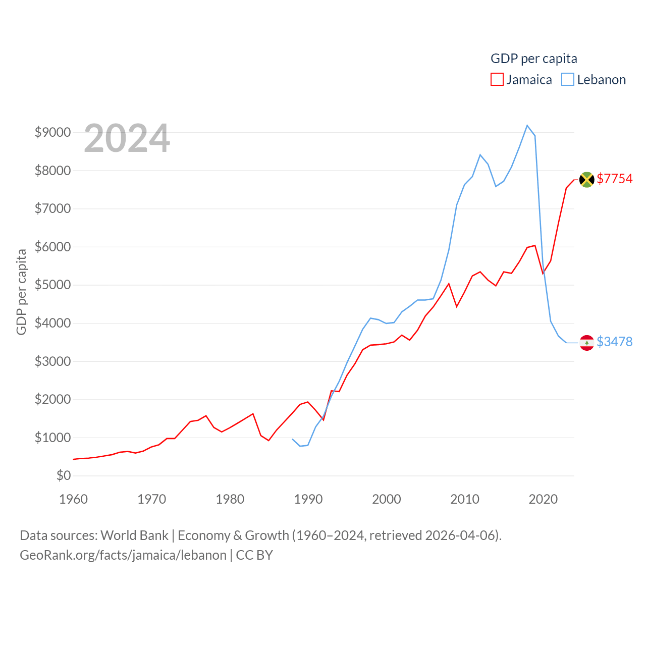 By GDP, Jamaica ranks 124/197 ($22B) and Lebanon ranks 128/197 ($20.1B). By GDP per capita, Jamaica ranks 95/197 ($7,754), while Lebanon ranks 135/197 ($3,478).