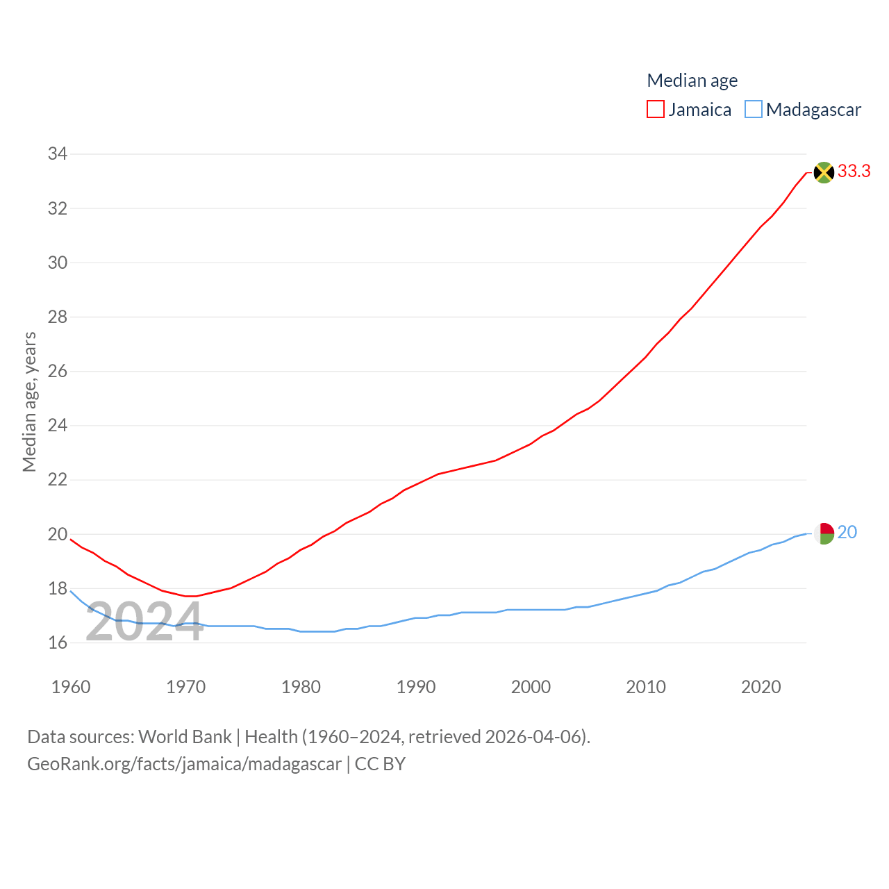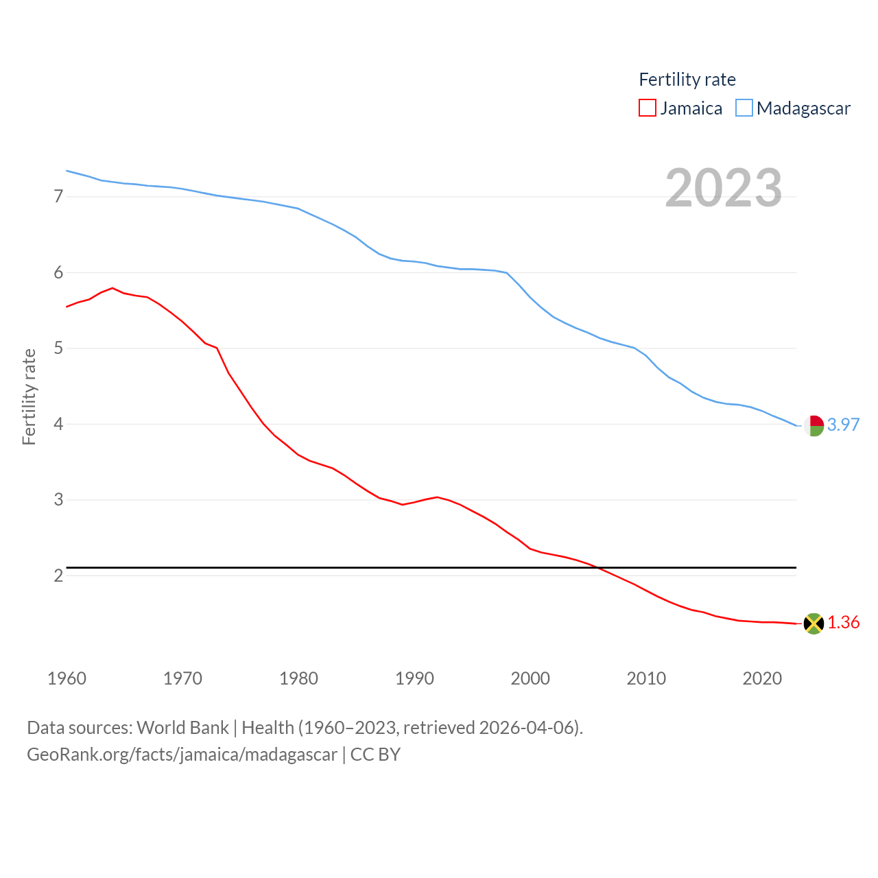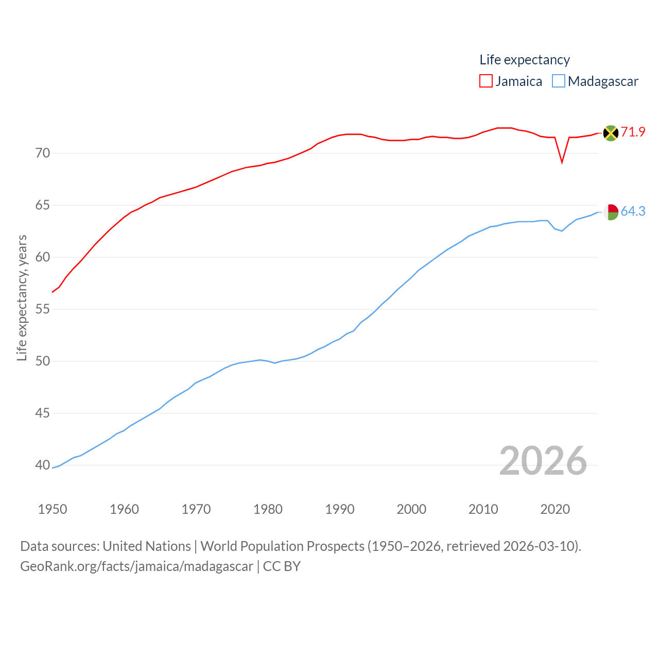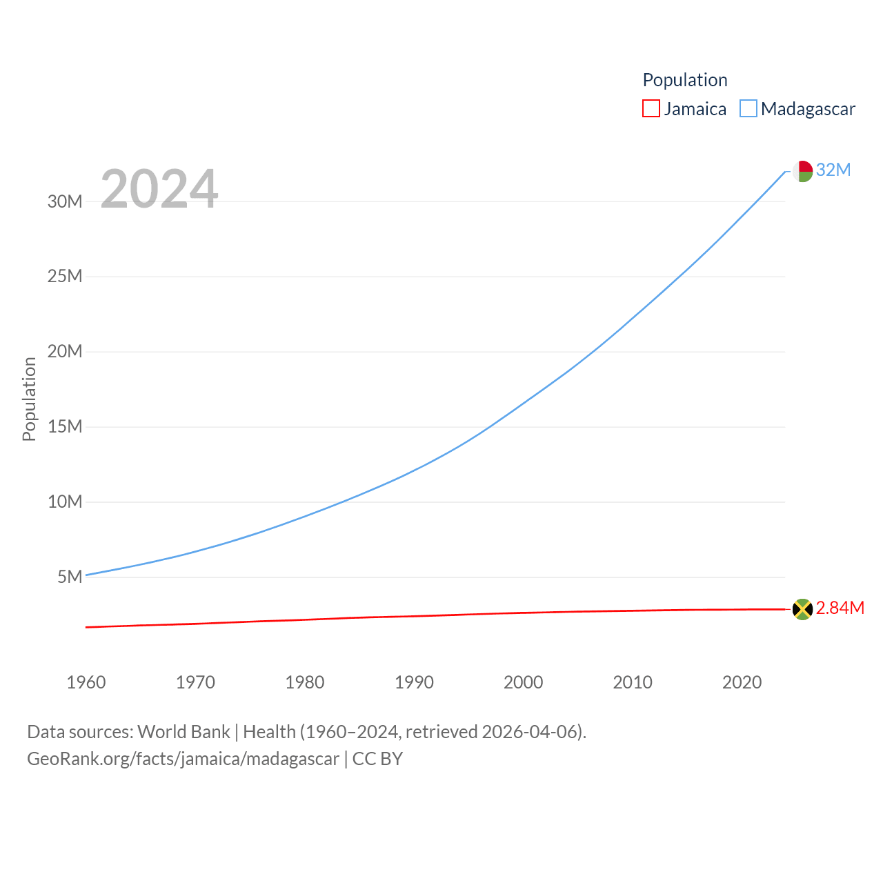 Jamaica has a population of 2.84M (ranked 139/197), compared with 32M in Madagascar (ranked 49/197). Jamaica's land area is 4,181 sq mi versus 224,634 sq mi for Madagascar (ranked 159th vs. 44th).