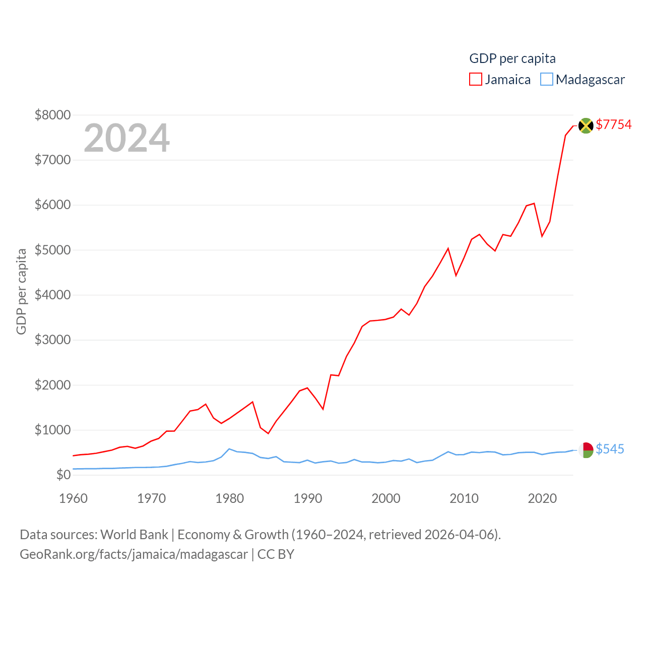By GDP, Jamaica ranks 124/197 ($22B) and Madagascar ranks 136/197 ($17.4B). By GDP per capita, Jamaica ranks 95/197 ($7,754), while Madagascar ranks 193/197 ($545).
