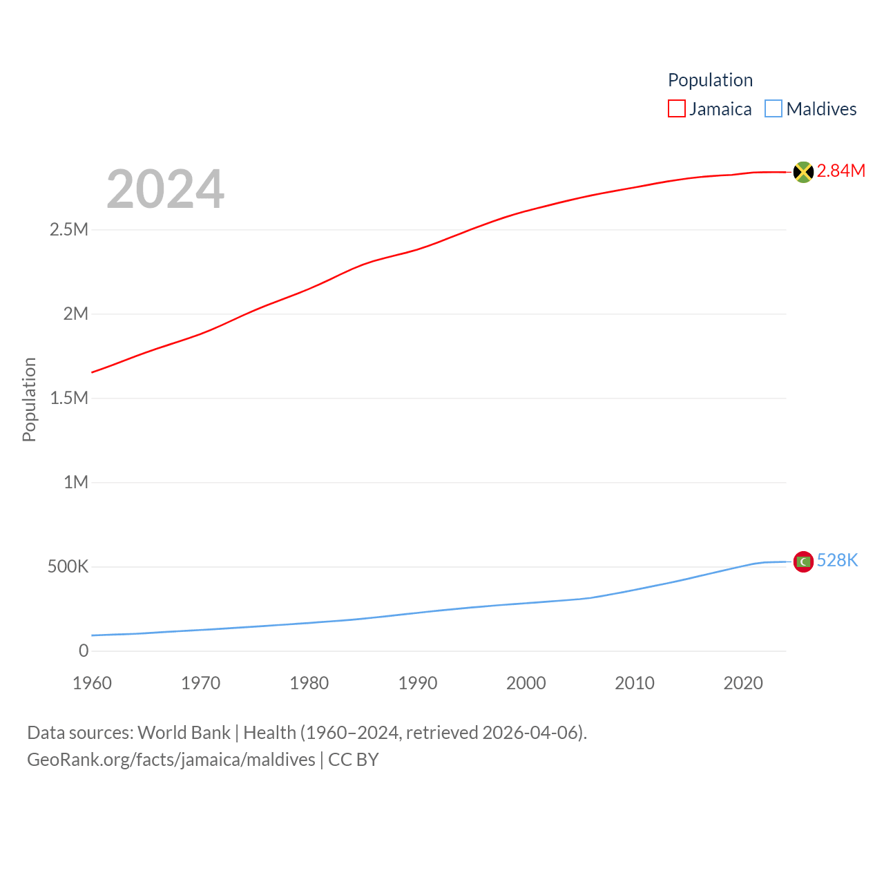 Jamaica has a population of 2.84M (ranked 139/197), compared with 528K in Maldives (ranked 168/197). Jamaica's land area is 4,181 sq mi versus 115.1 sq mi for Maldives (ranked 159th vs. 188th).
