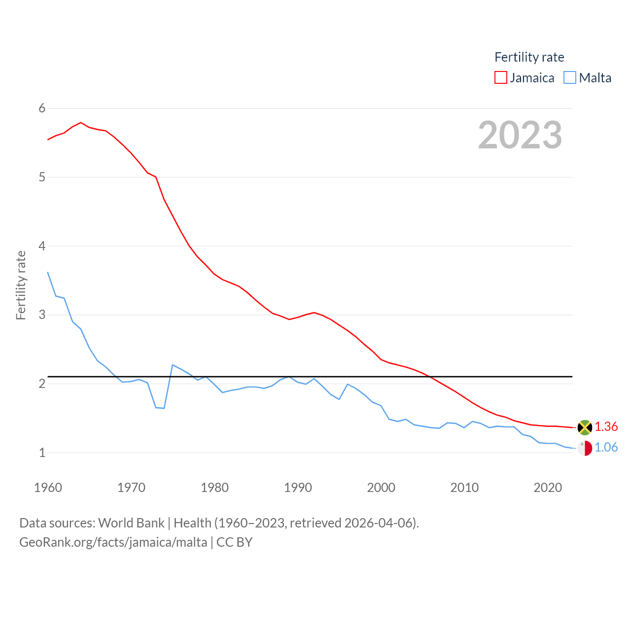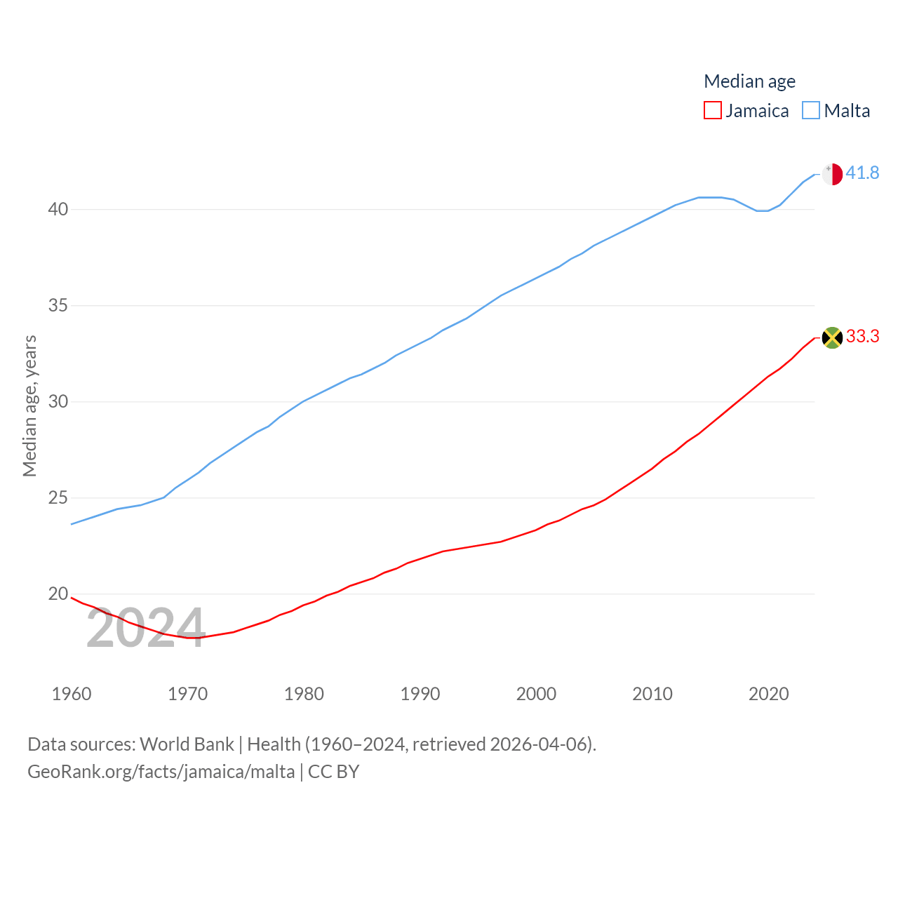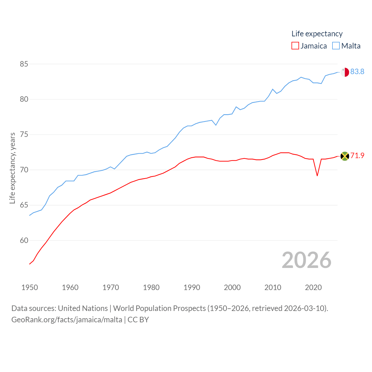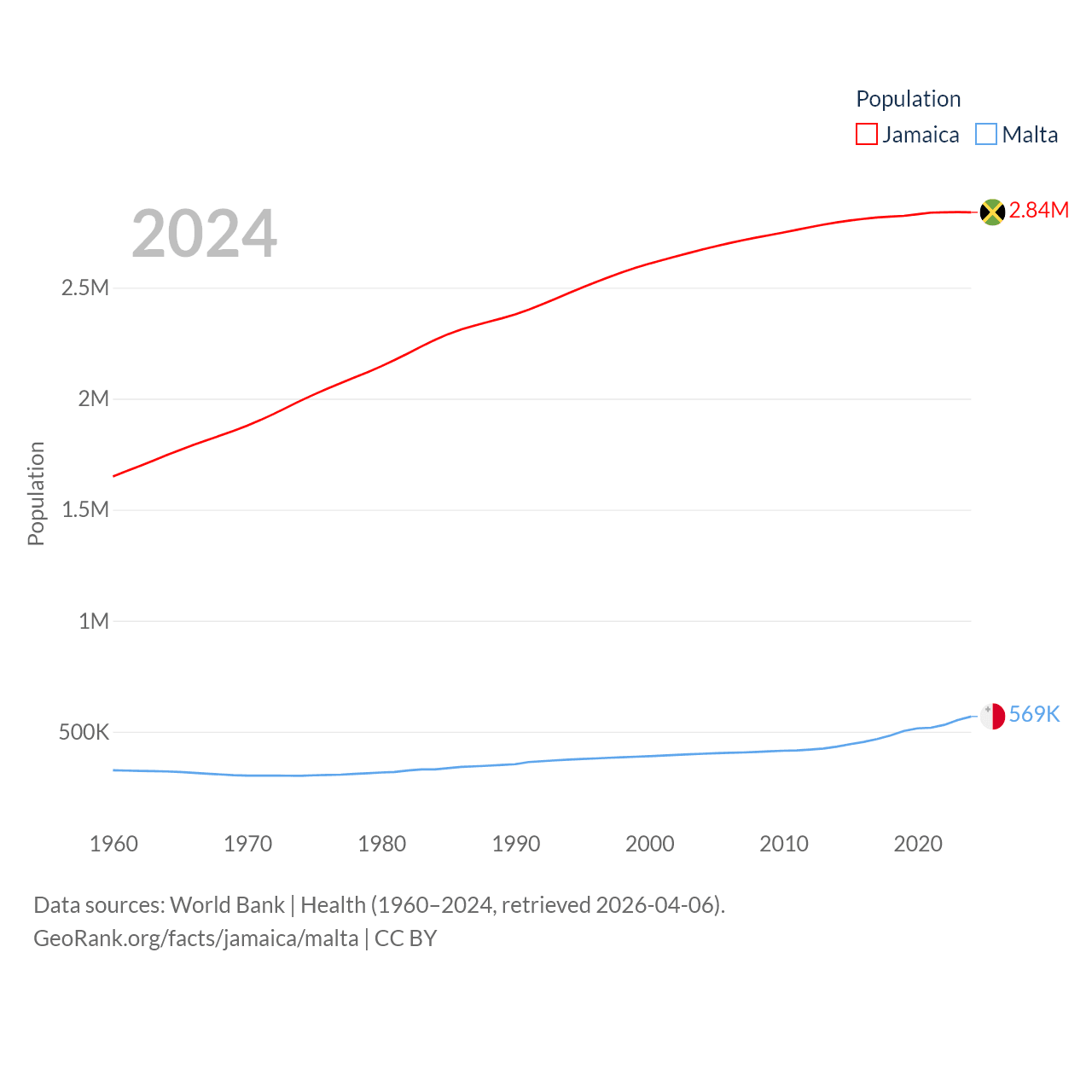 Jamaica has a population of 2.84M (ranked 139/197), compared with 569K in Malta (ranked 167/197). Jamaica's land area is 4,181 sq mi versus 123.6 sq mi for Malta (ranked 159th vs. 187th).