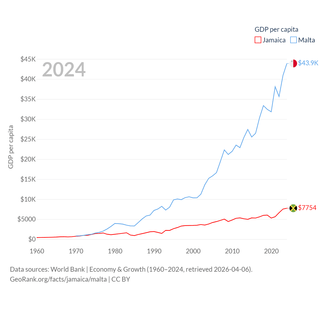 By GDP, Jamaica ranks 124/197 ($22B) and Malta ranks 119/197 ($25B). By GDP per capita, Jamaica ranks 95/197 ($7,754), while Malta ranks 28/197 ($43,899).