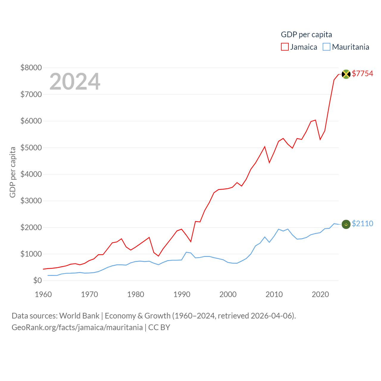 By GDP, Jamaica ranks 124/197 ($22B) and Mauritania ranks 153/197 ($10.9B). By GDP per capita, Jamaica ranks 95/197 ($7,754), while Mauritania ranks 156/197 ($2,110).
