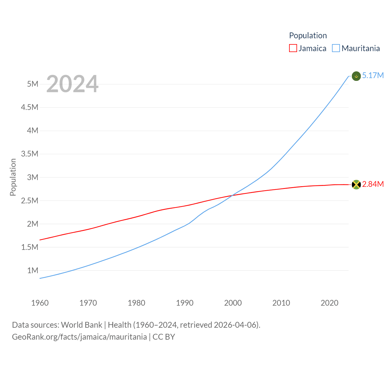 Jamaica has a population of 2.84M (ranked 139/197), compared with 5.17M in Mauritania (ranked 125/197). Jamaica's land area is 4,181 sq mi versus 397,955 sq mi for Mauritania (ranked 159th vs. 28th).