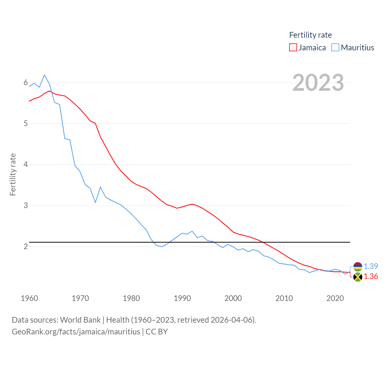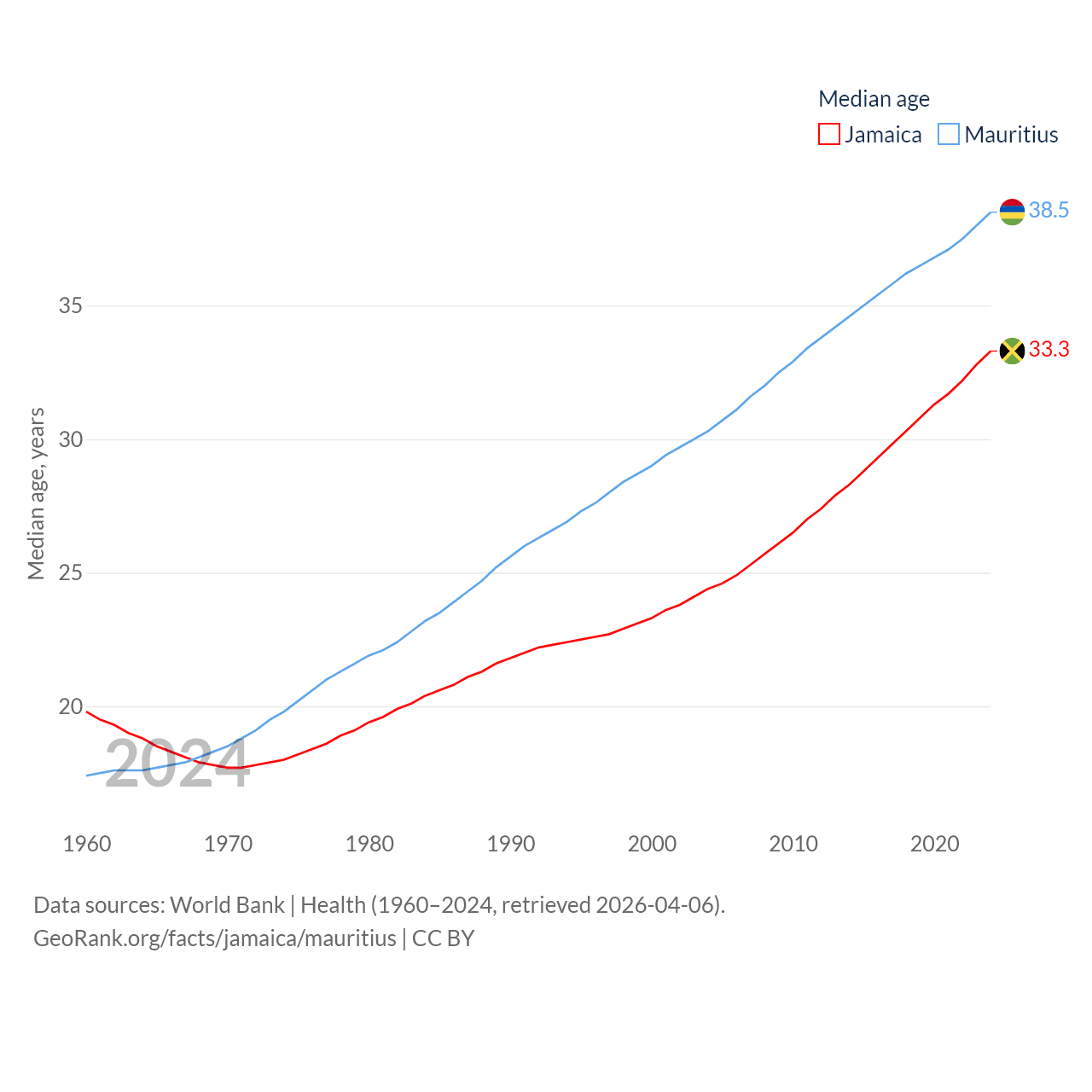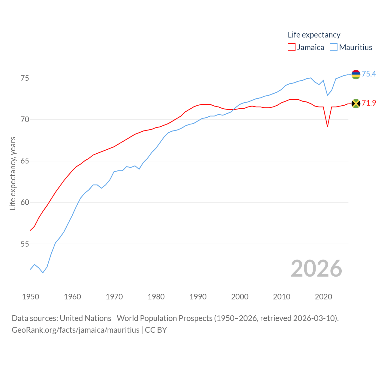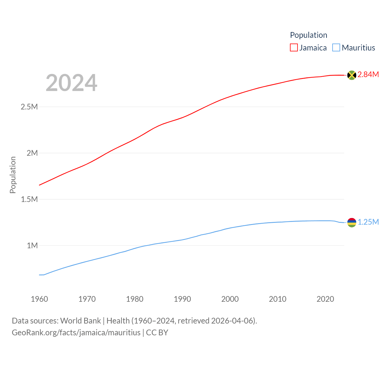 Jamaica has a population of 2.84M (ranked 139/197), compared with 1.25M in Mauritius (ranked 156/197). Jamaica's land area is 4,181 sq mi versus 771 sq mi for Mauritius (ranked 159th vs. 170th).