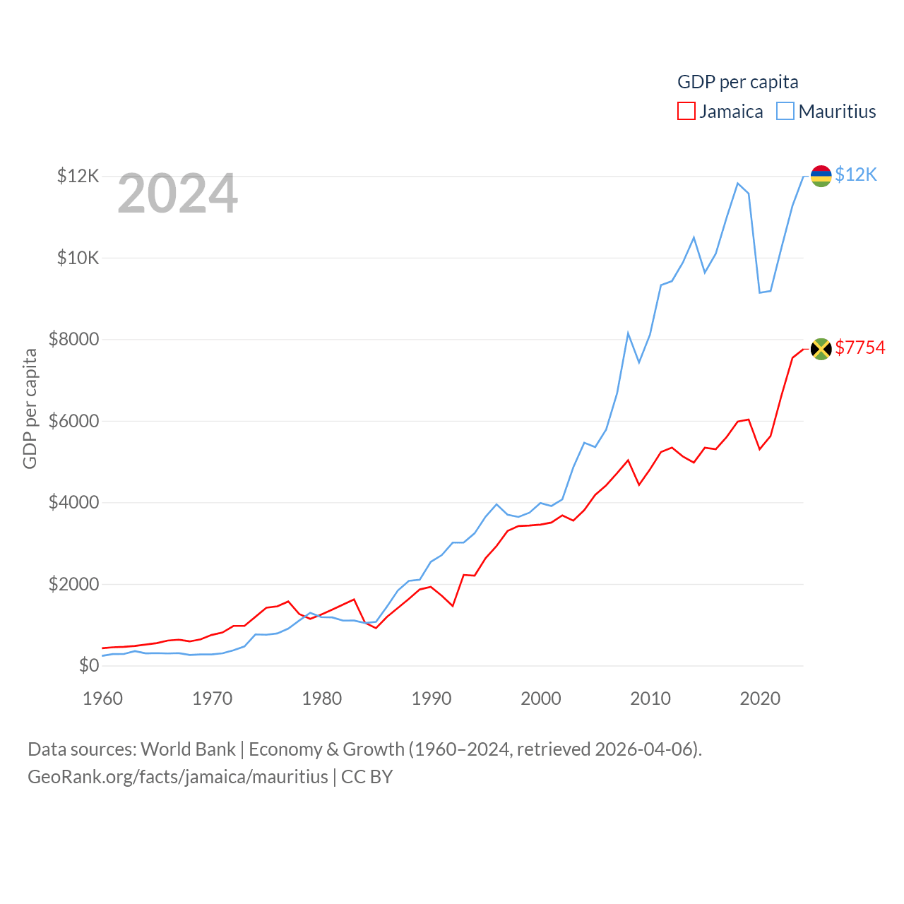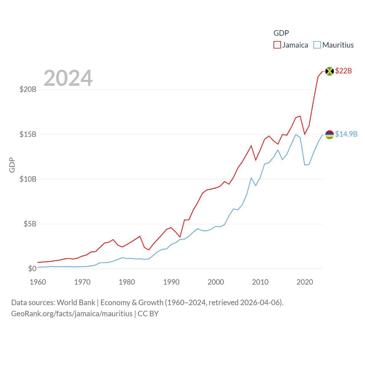 By GDP, Jamaica ranks 124/197 ($22B) and Mauritius ranks 143/197 ($14.9B). By GDP per capita, Jamaica ranks 95/197 ($7,754), while Mauritius ranks 78/197 ($11,991).