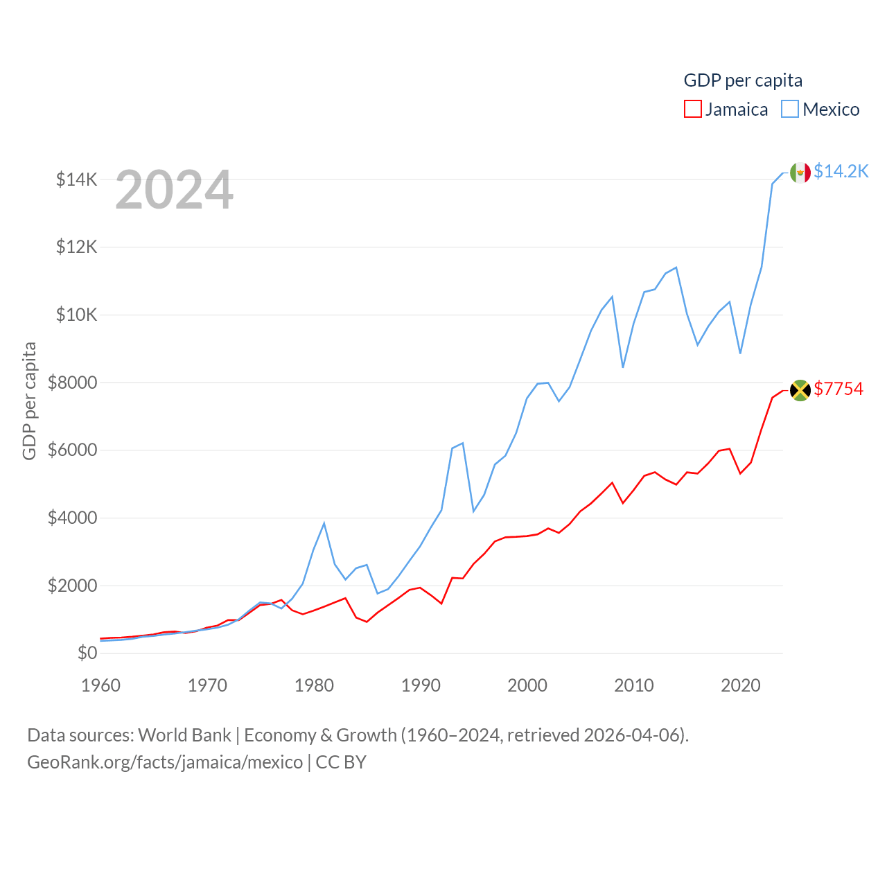 By GDP, Jamaica ranks 124/197 ($22B) and Mexico ranks 13/197 ($1.86T). By GDP per capita, Jamaica ranks 95/197 ($7,754), while Mexico ranks 69/197 ($14,186).