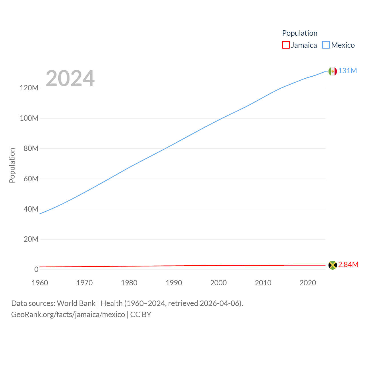 Jamaica has a population of 2.84M (ranked 139/197), compared with 131M in Mexico (ranked 11/197). Jamaica's land area is 4,181 sq mi versus 750,563 sq mi for Mexico (ranked 159th vs. 13th).