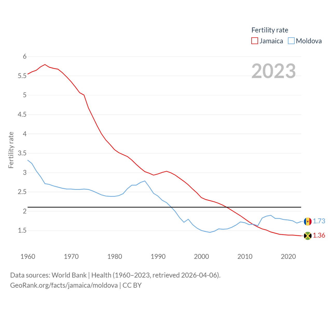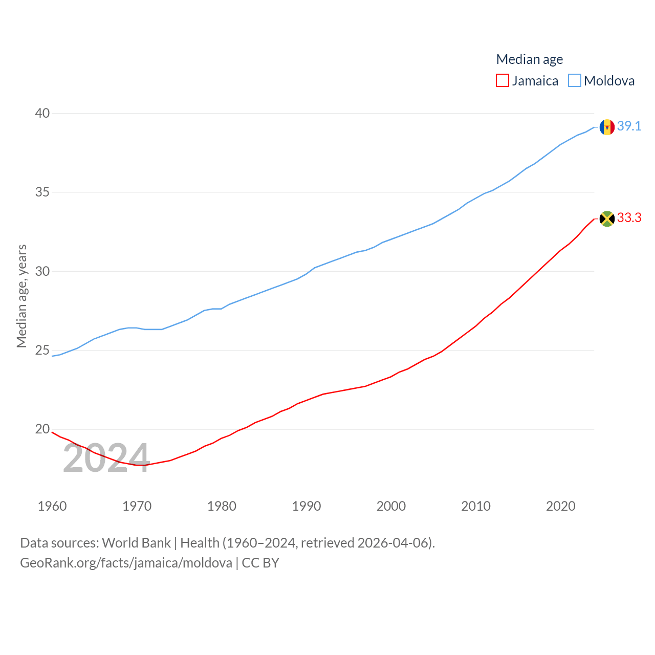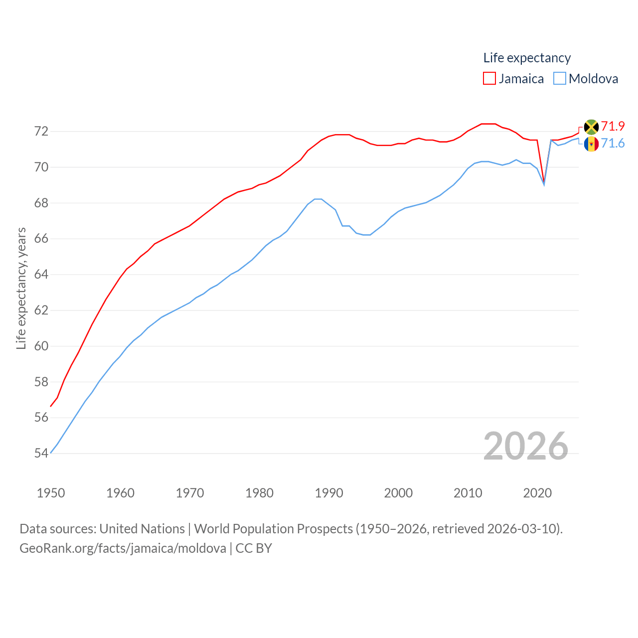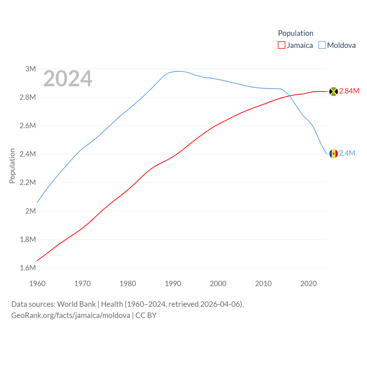 Jamaica has a population of 2.84M (ranked 139/197), compared with 2.4M in Moldova (ranked 143/197). Jamaica's land area is 4,181 sq mi versus 12,714 sq mi for Moldova (ranked 159th vs. 135th).
