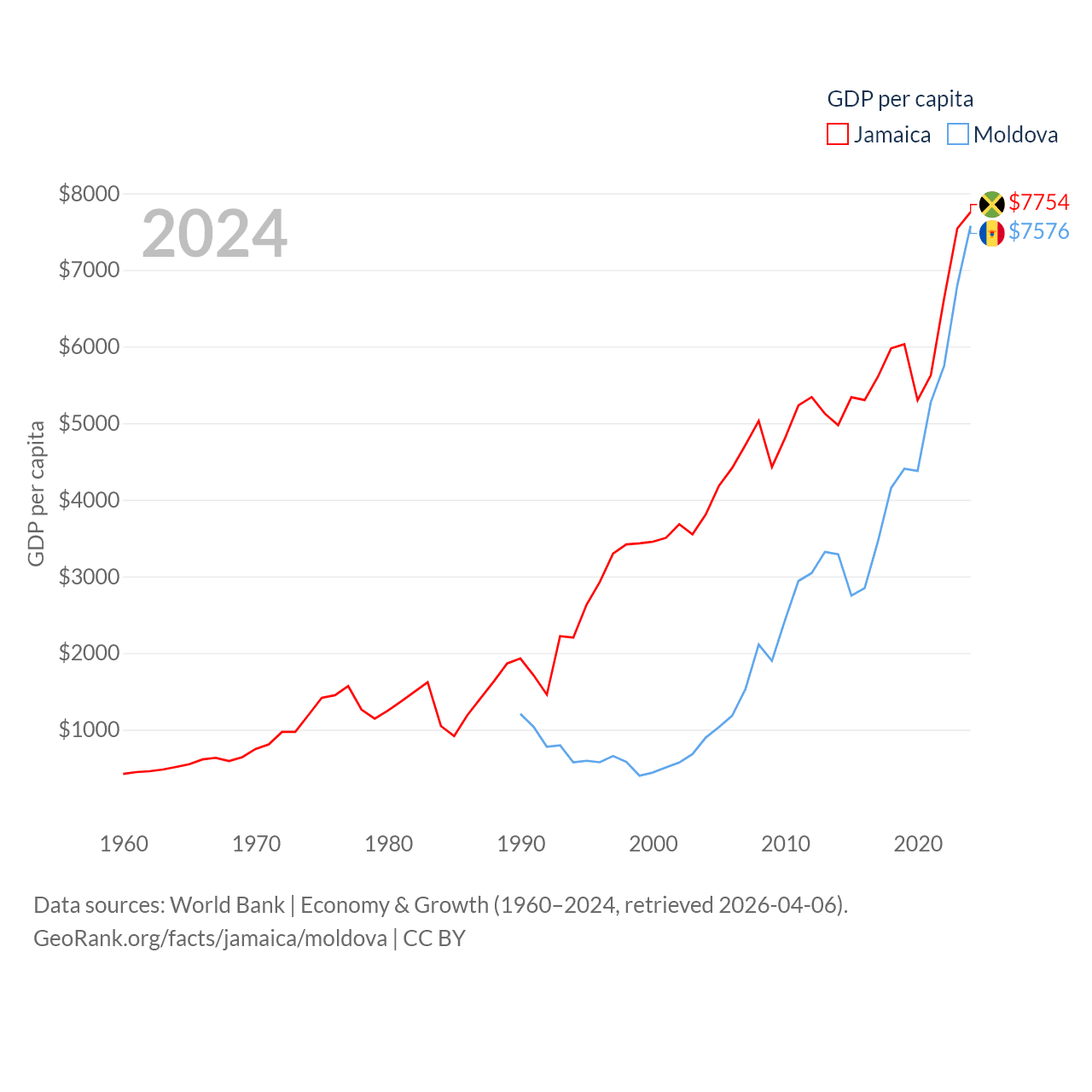 By GDP, Jamaica ranks 124/197 ($22B) and Moldova ranks 134/197 ($18.2B). By GDP per capita, Jamaica ranks 95/197 ($7,754), while Moldova ranks 99/197 ($7,576).
