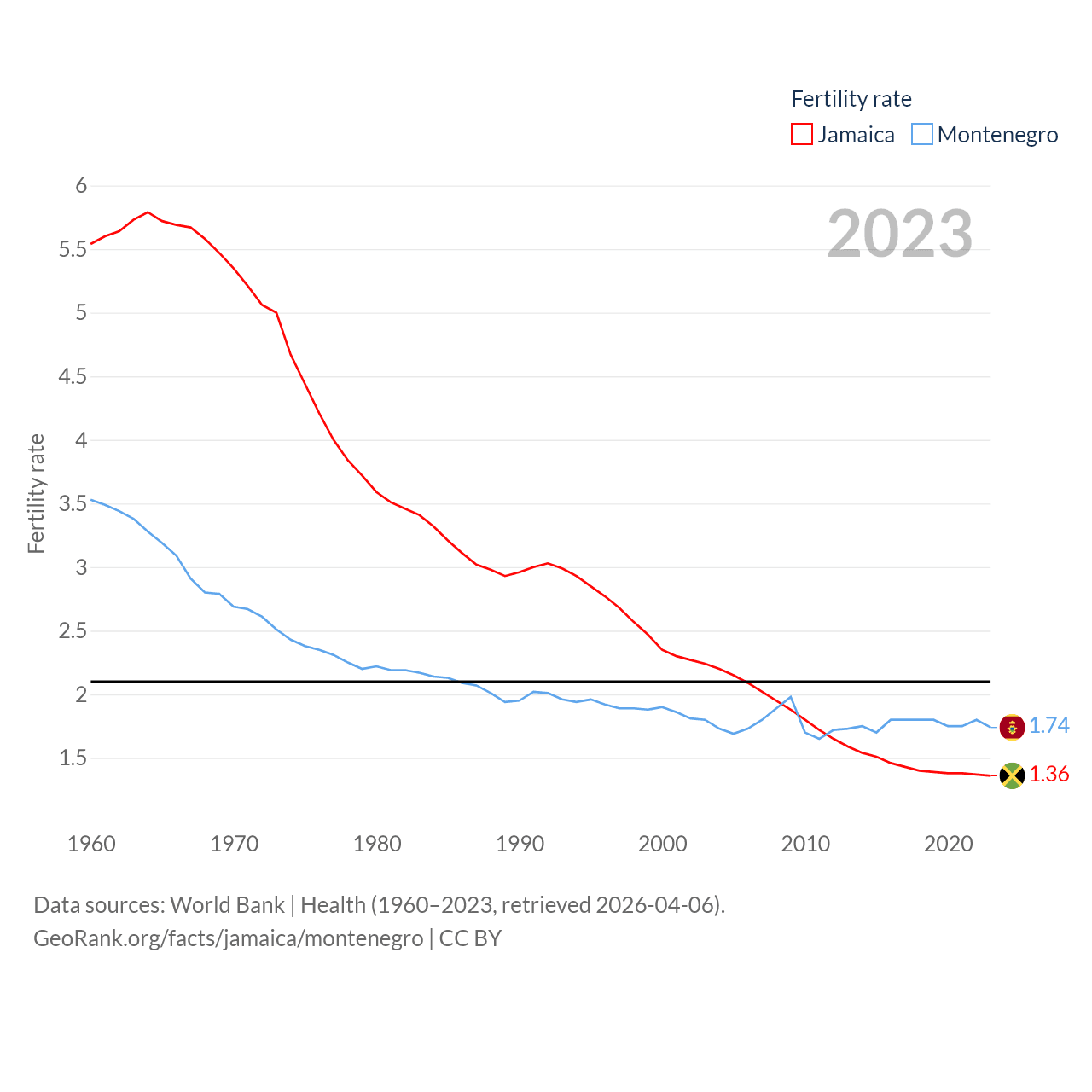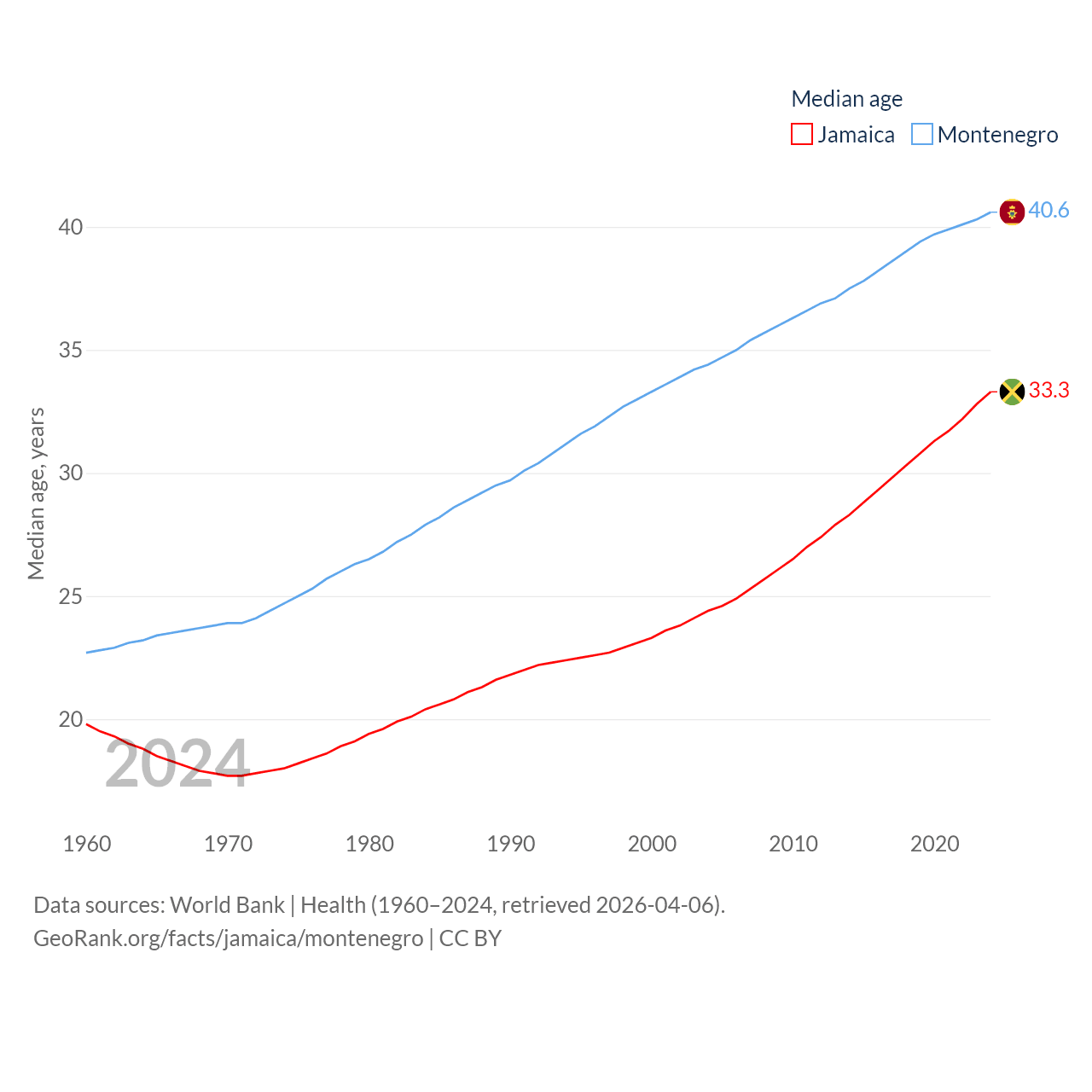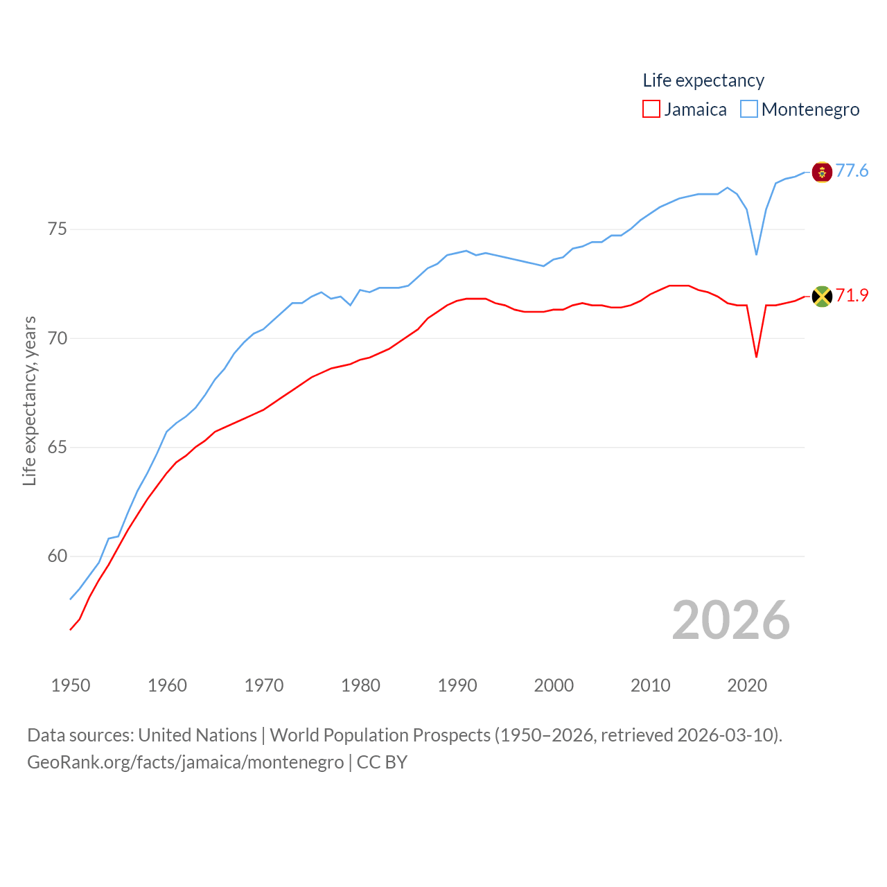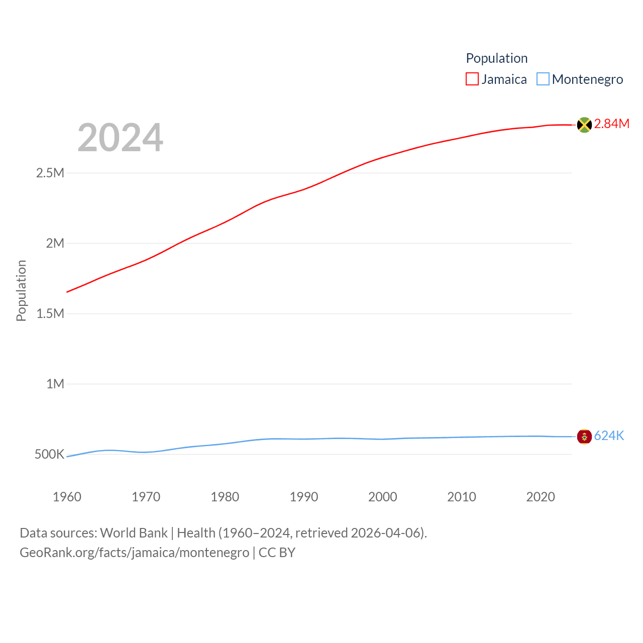 Jamaica has a population of 2.84M (ranked 139/197), compared with 624K in Montenegro (ranked 166/197). Jamaica's land area is 4,181 sq mi versus 5,193 sq mi for Montenegro (ranked 159th vs. 156th).