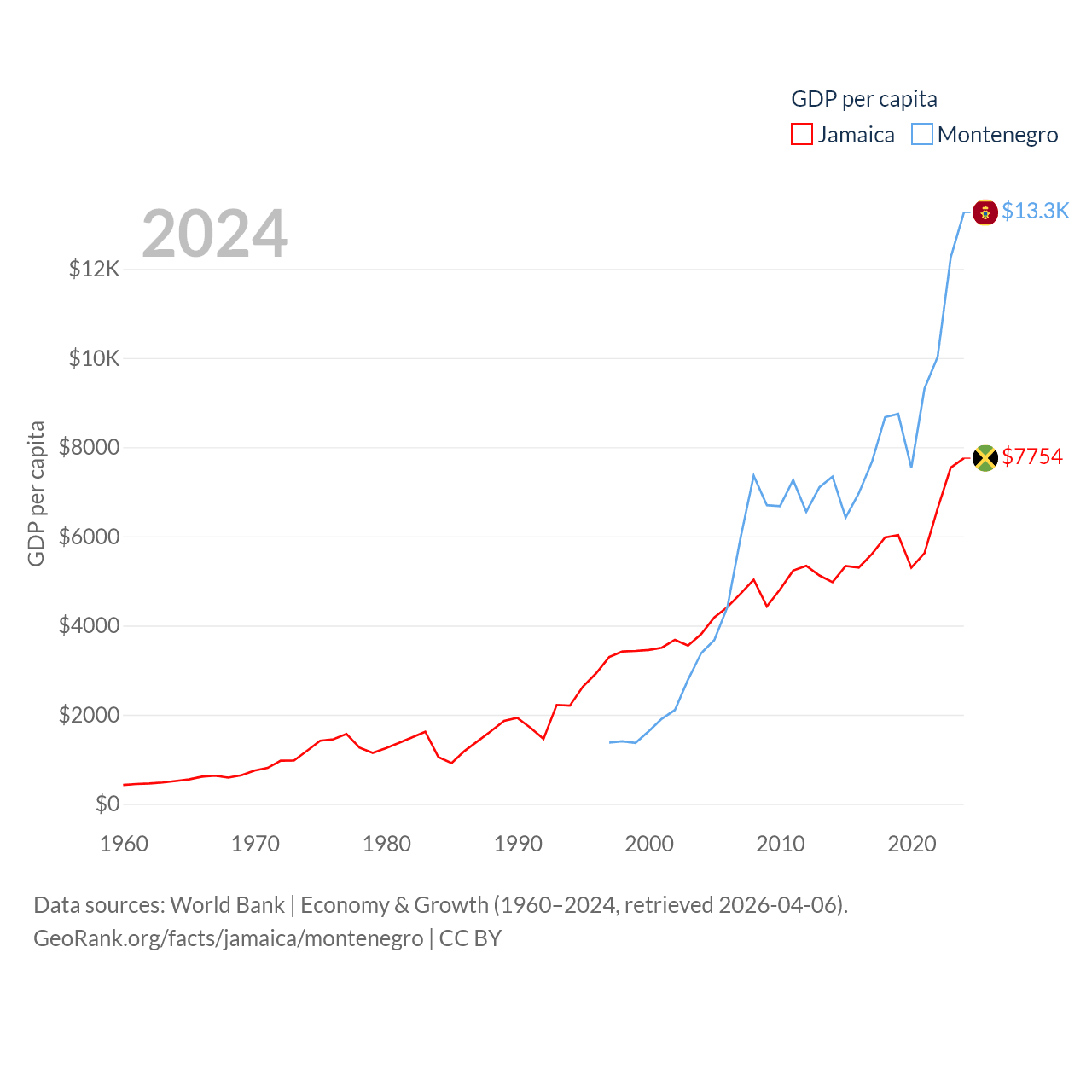 By GDP, Jamaica ranks 124/197 ($22B) and Montenegro ranks 155/197 ($8.27B). By GDP per capita, Jamaica ranks 95/197 ($7,754), while Montenegro ranks 77/197 ($13,263).