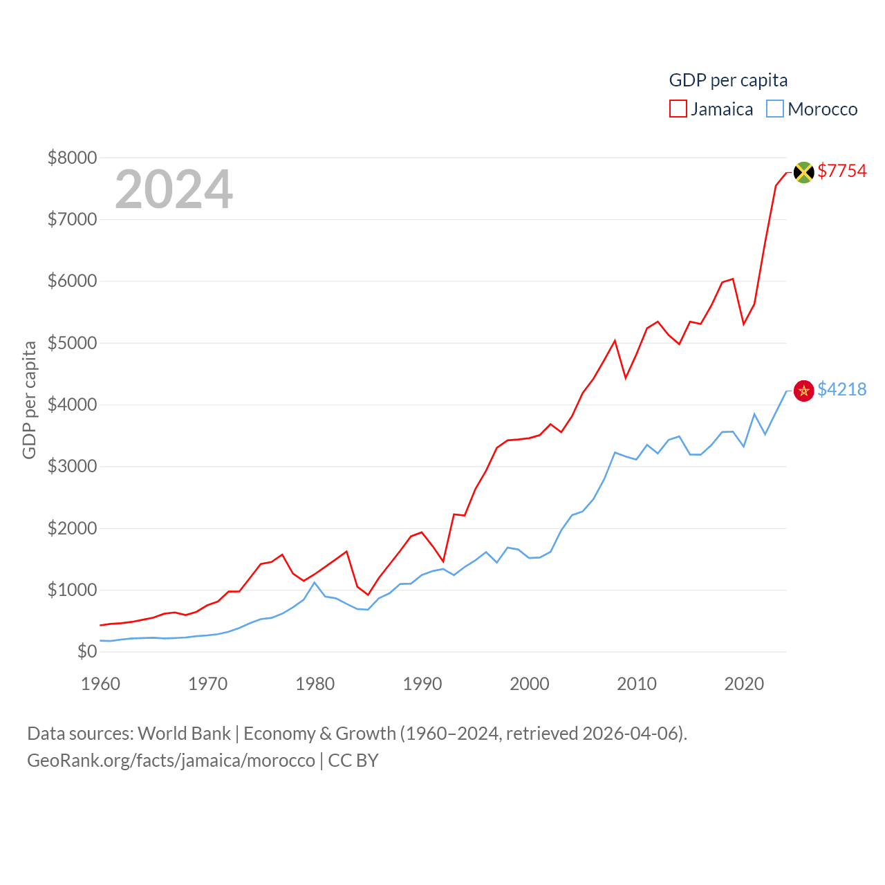 By GDP, Jamaica ranks 124/197 ($22B) and Morocco ranks 58/197 ($161B). By GDP per capita, Jamaica ranks 95/197 ($7,754), while Morocco ranks 127/197 ($4,218).