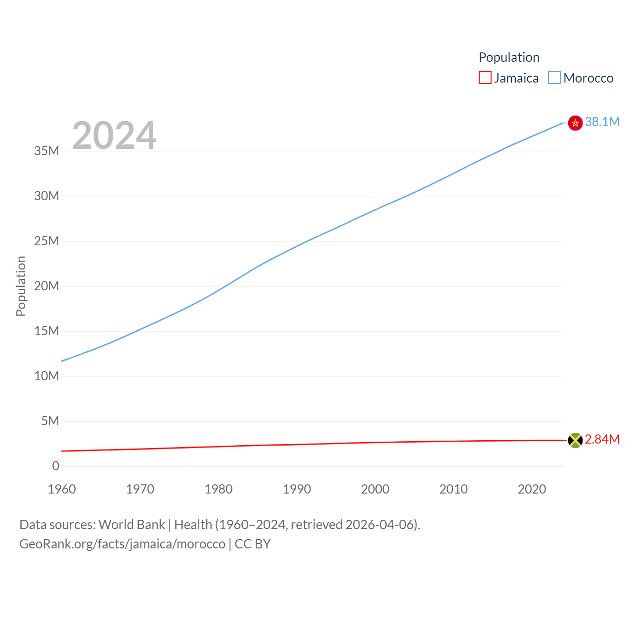 Jamaica has a population of 2.84M (ranked 139/197), compared with 38.1M in Morocco (ranked 39/197). Jamaica's land area is 4,181 sq mi versus 172,317 sq mi for Morocco (ranked 159th vs. 55th).
