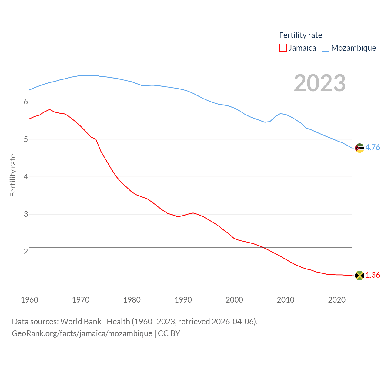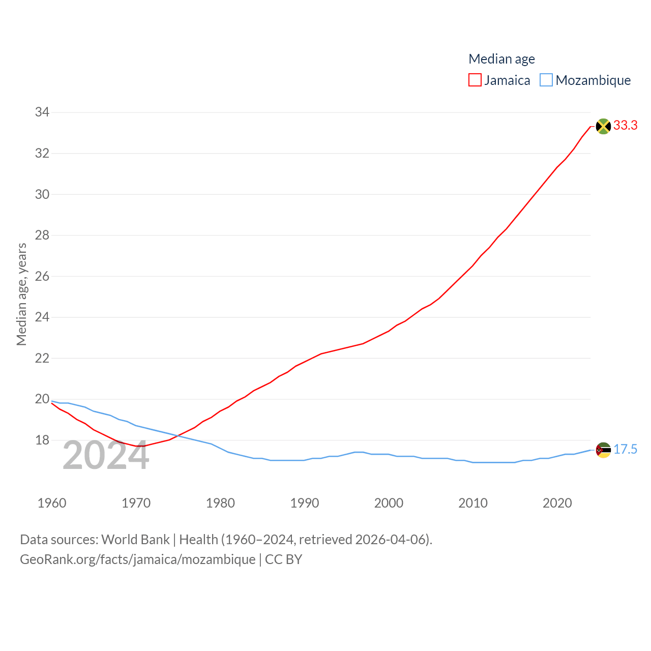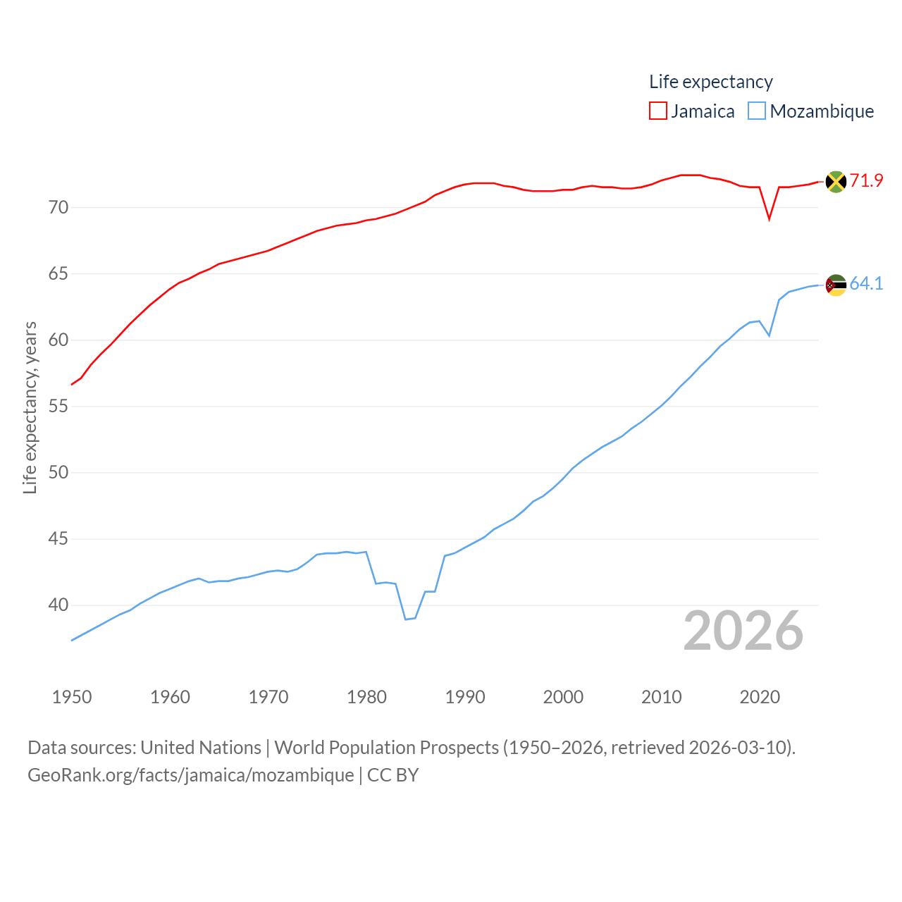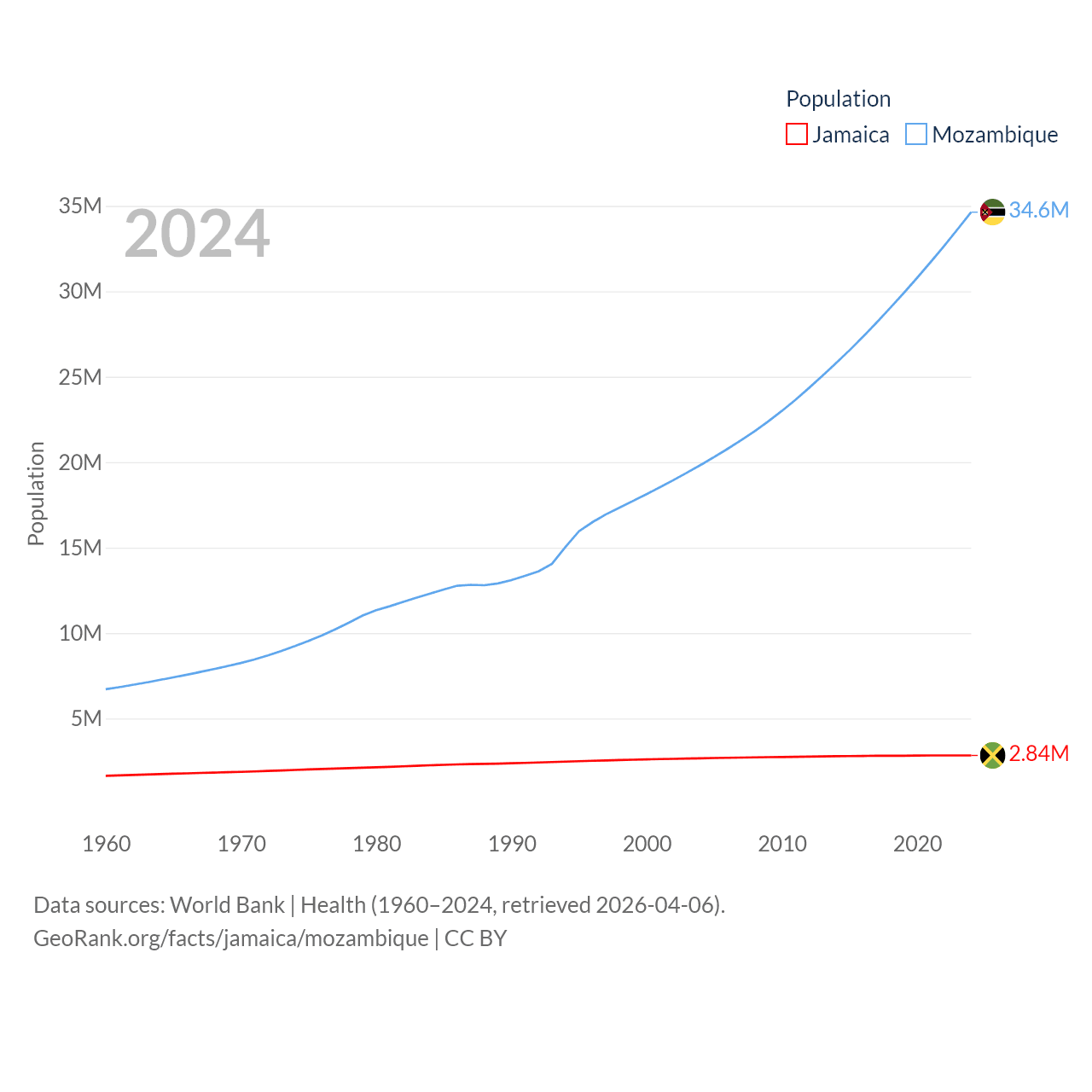 Jamaica has a population of 2.84M (ranked 139/197), compared with 34.6M in Mozambique (ranked 46/197). Jamaica's land area is 4,181 sq mi versus 303,623 sq mi for Mozambique (ranked 159th vs. 34th).