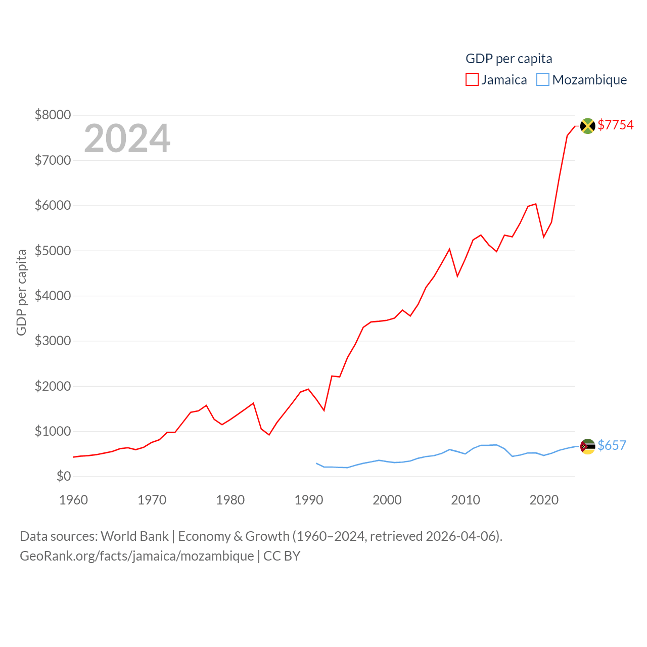 By GDP, Jamaica ranks 124/197 ($22B) and Mozambique ranks 123/197 ($22.7B). By GDP per capita, Jamaica ranks 95/197 ($7,754), while Mozambique ranks 189/197 ($657).