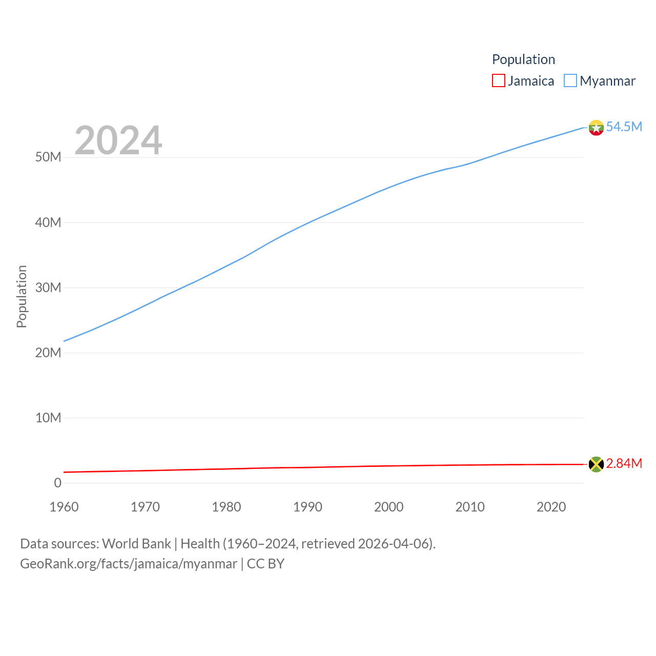 Jamaica has a population of 2.84M (ranked 139/197), compared with 54.5M in Myanmar (ranked 27/197). Jamaica's land area is 4,181 sq mi versus 251,997 sq mi for Myanmar (ranked 159th vs. 39th).