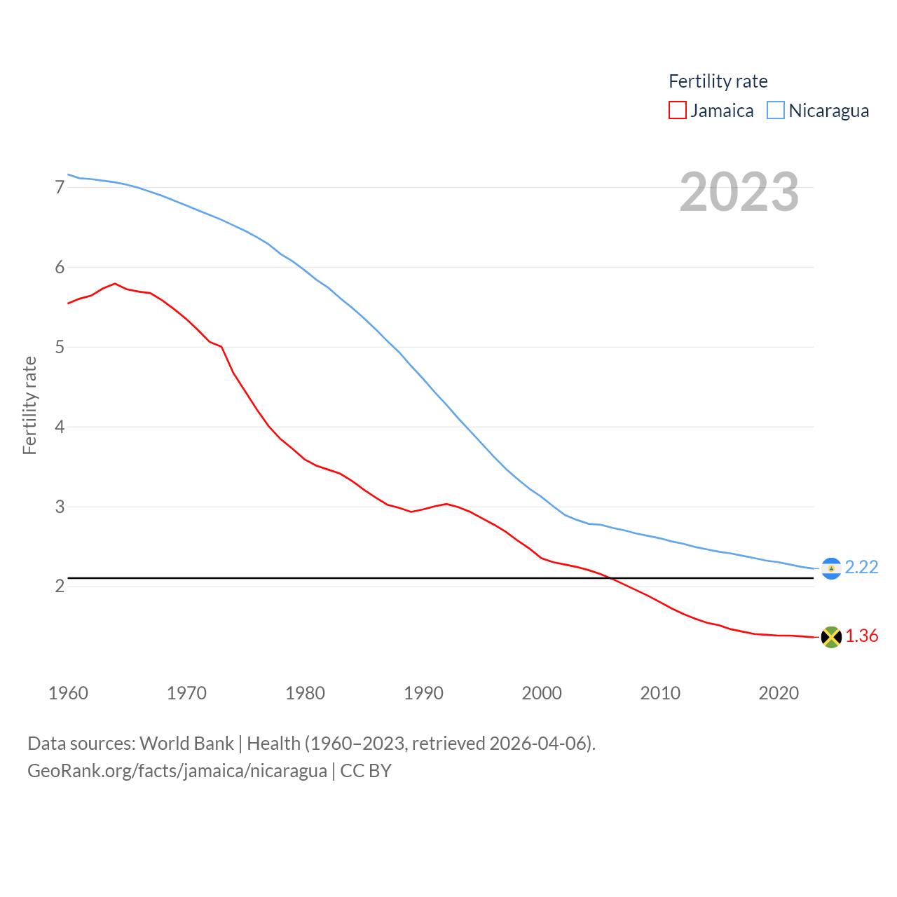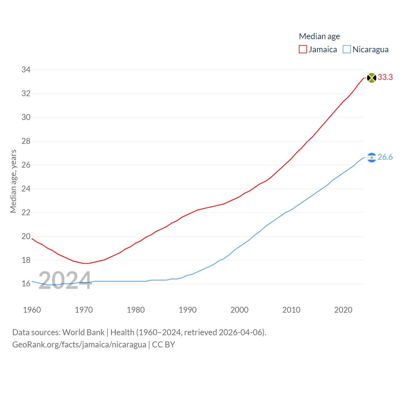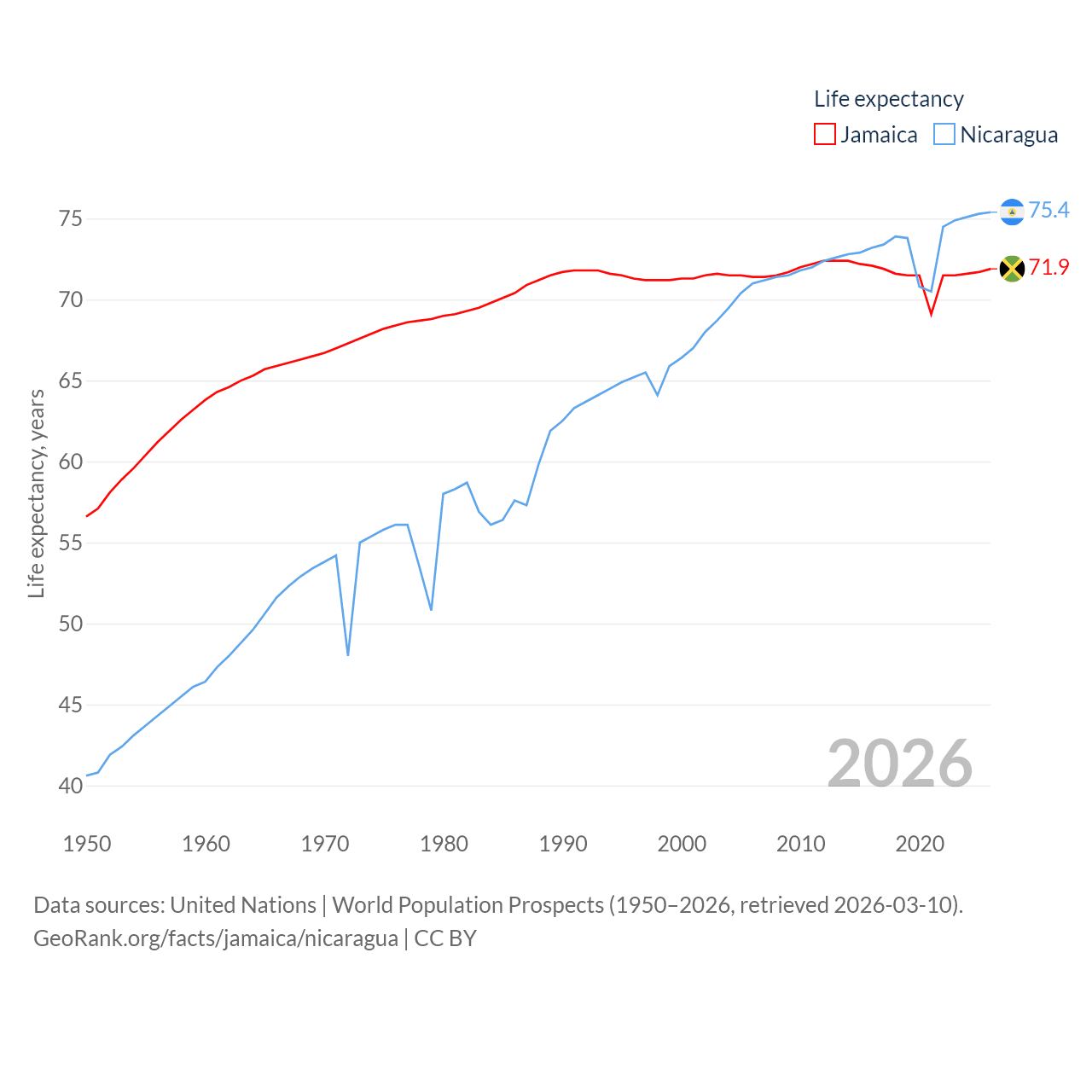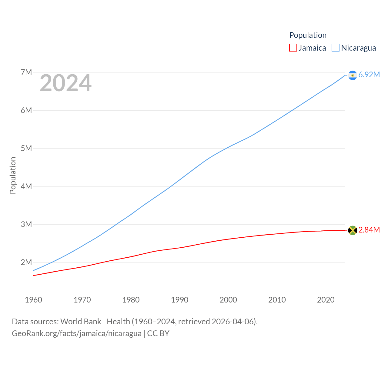 Jamaica has a population of 2.84M (ranked 139/197), compared with 6.92M in Nicaragua (ranked 108/197). Jamaica's land area is 4,181 sq mi versus 46,464 sq mi for Nicaragua (ranked 159th vs. 98th).