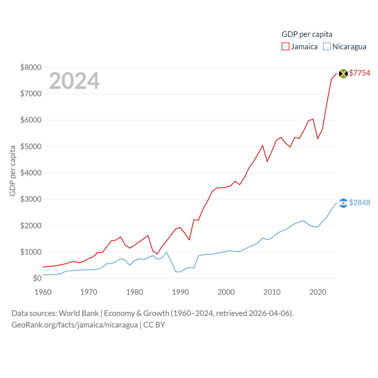 By GDP, Jamaica ranks 124/197 ($22B) and Nicaragua ranks 131/197 ($19.7B). By GDP per capita, Jamaica ranks 95/197 ($7,754), while Nicaragua ranks 141/197 ($2,848).