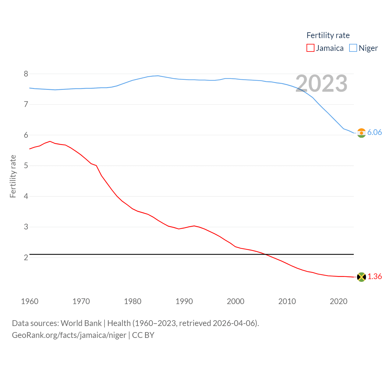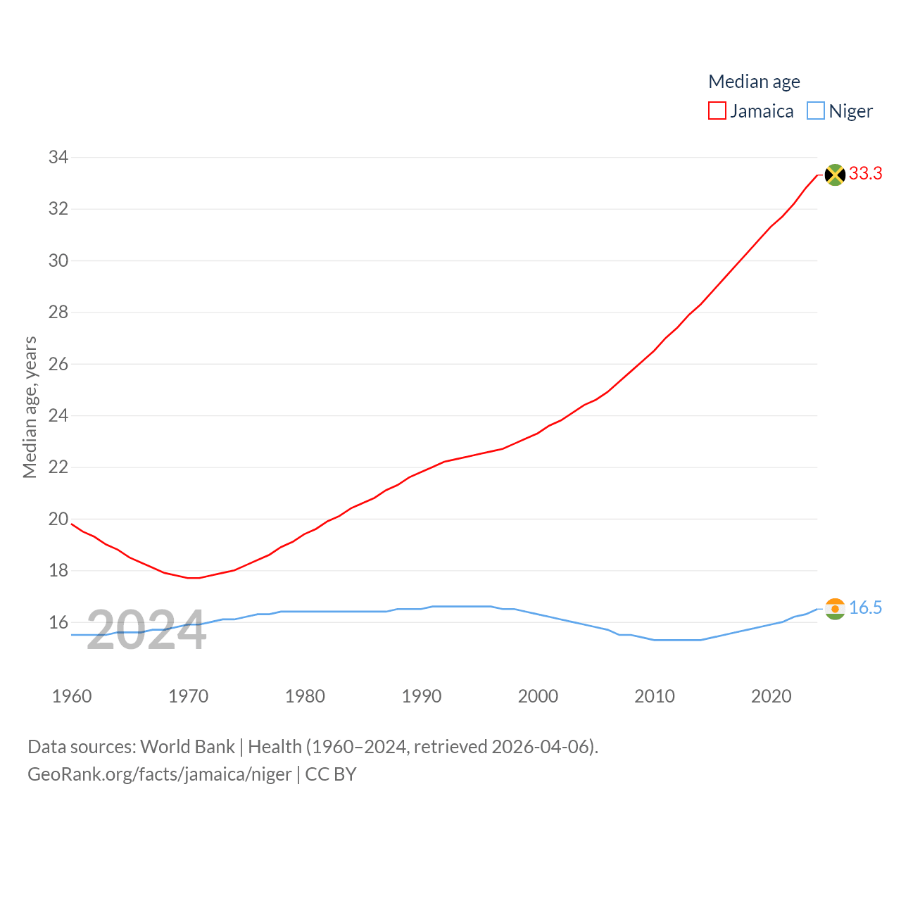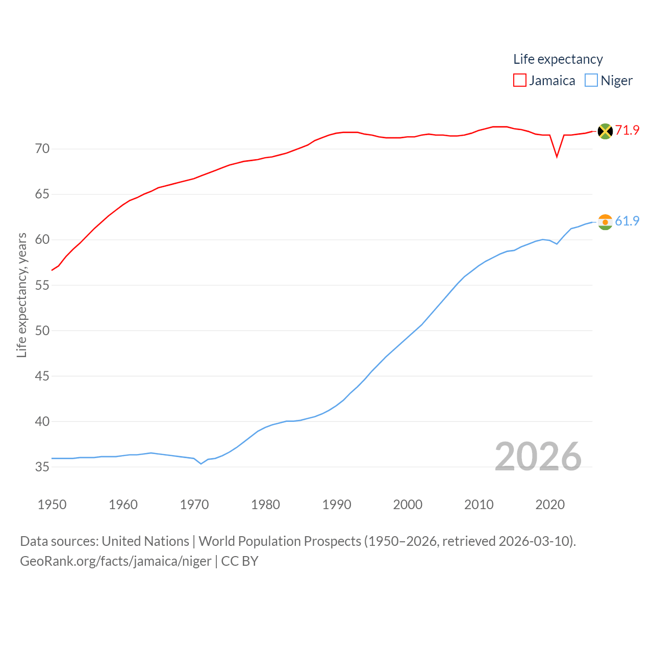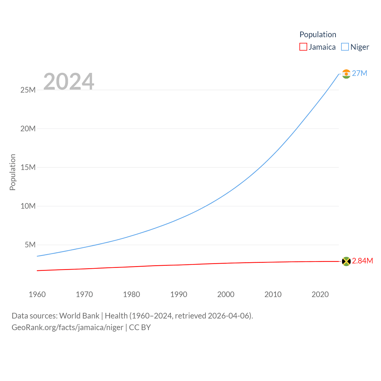 Jamaica has a population of 2.84M (ranked 139/197), compared with 27M in Niger (ranked 55/197). Jamaica's land area is 4,181 sq mi versus 489,076 sq mi for Niger (ranked 159th vs. 20th).