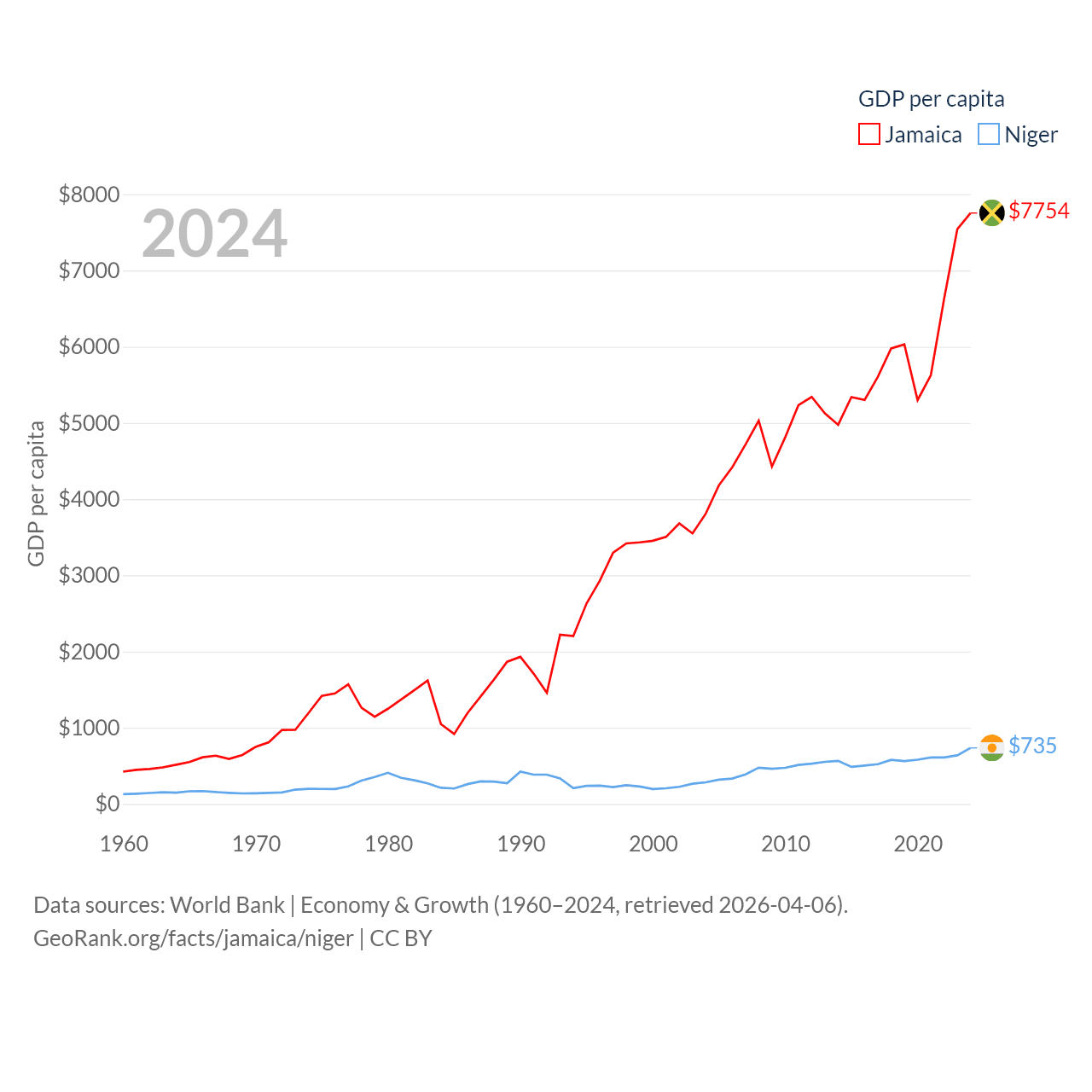 By GDP, Jamaica ranks 124/197 ($22B) and Niger ranks 130/197 ($19.9B). By GDP per capita, Jamaica ranks 95/197 ($7,754), while Niger ranks 187/197 ($735).