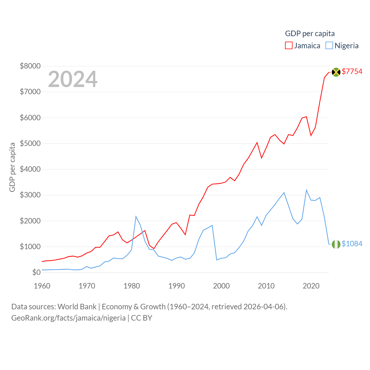 By GDP, Jamaica ranks 124/197 ($22B) and Nigeria ranks 54/197 ($252B). By GDP per capita, Jamaica ranks 95/197 ($7,754), while Nigeria ranks 174/197 ($1,084).