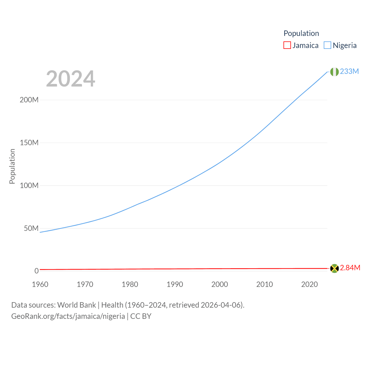 Jamaica has a population of 2.84M (ranked 139/197), compared with 233M in Nigeria (ranked 6/197). Jamaica's land area is 4,181 sq mi versus 351,650 sq mi for Nigeria (ranked 159th vs. 30th).