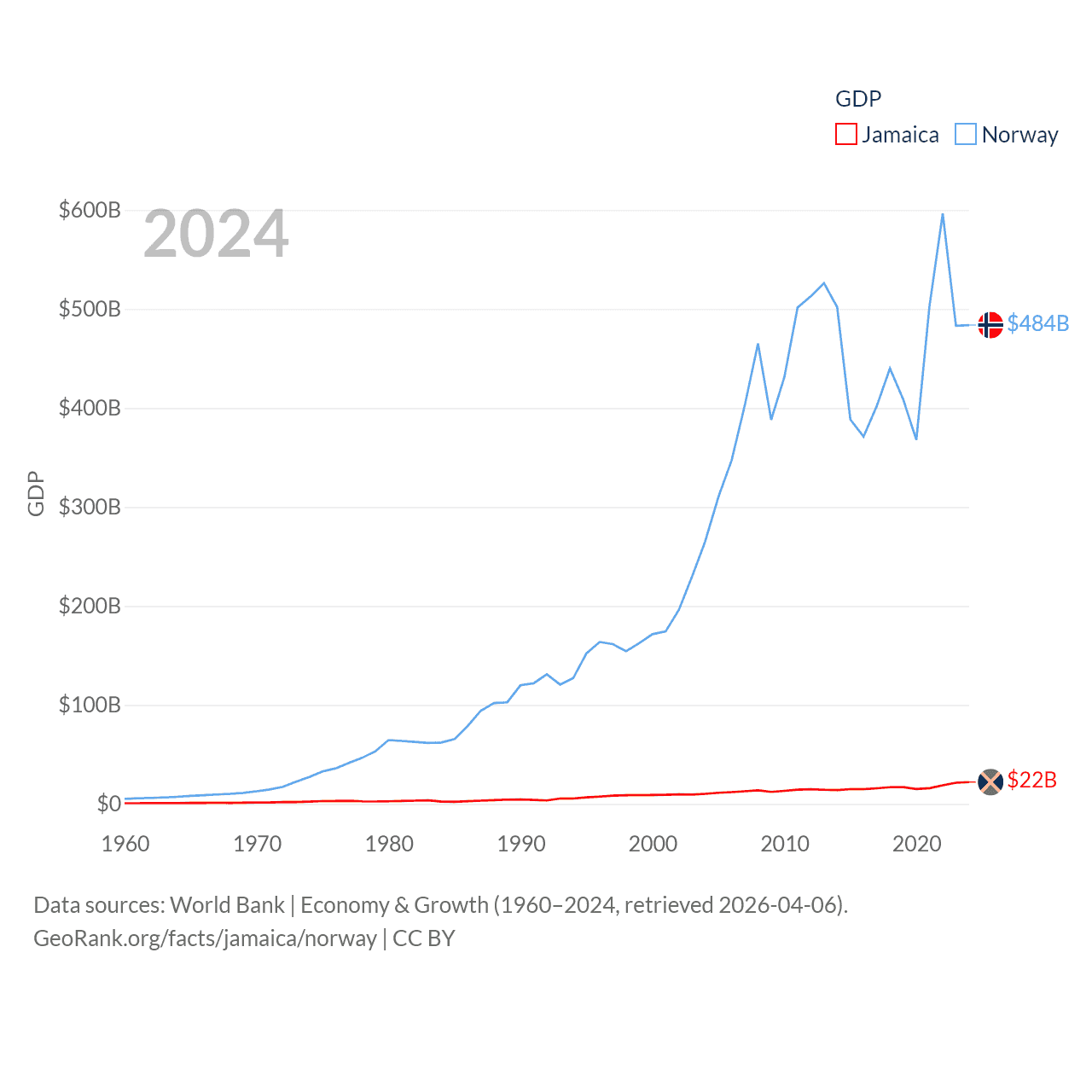 By GDP, Jamaica ranks 124/197 ($22B) and Norway ranks 32/197 ($484B). By GDP per capita, Jamaica ranks 95/197 ($7,754), while Norway ranks 8/197 ($86,785).