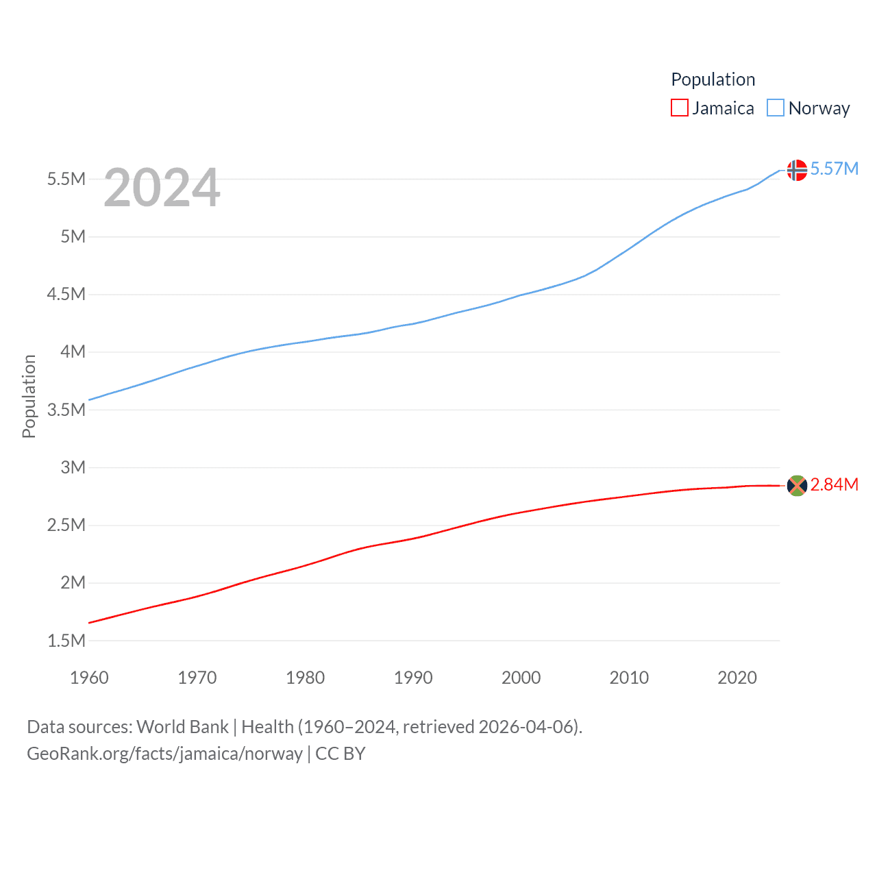 Jamaica has a population of 2.84M (ranked 139/197), compared with 5.57M in Norway (ranked 118/197). Jamaica's land area is 4,181 sq mi versus 140,645 sq mi for Norway (ranked 159th vs. 62nd).