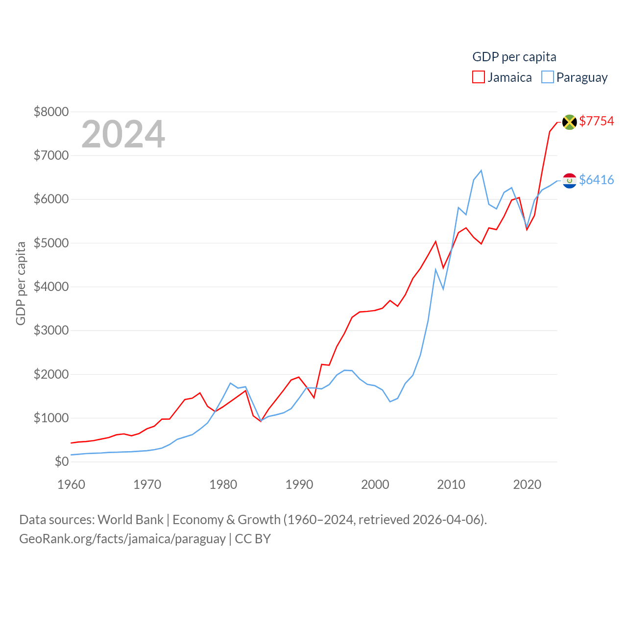 By GDP, Jamaica ranks 124/197 ($22B) and Paraguay ranks 98/197 ($44.5B). By GDP per capita, Jamaica ranks 95/197 ($7,754), while Paraguay ranks 109/197 ($6,416).
