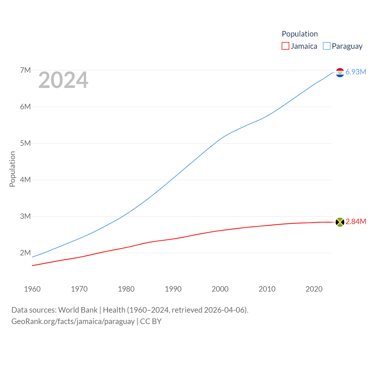 Jamaica has a population of 2.84M (ranked 139/197), compared with 6.93M in Paraguay (ranked 107/197). Jamaica's land area is 4,181 sq mi versus 152,901 sq mi for Paraguay (ranked 159th vs. 59th).