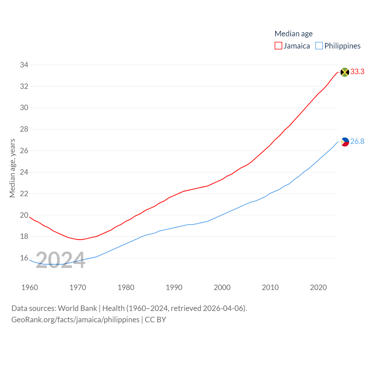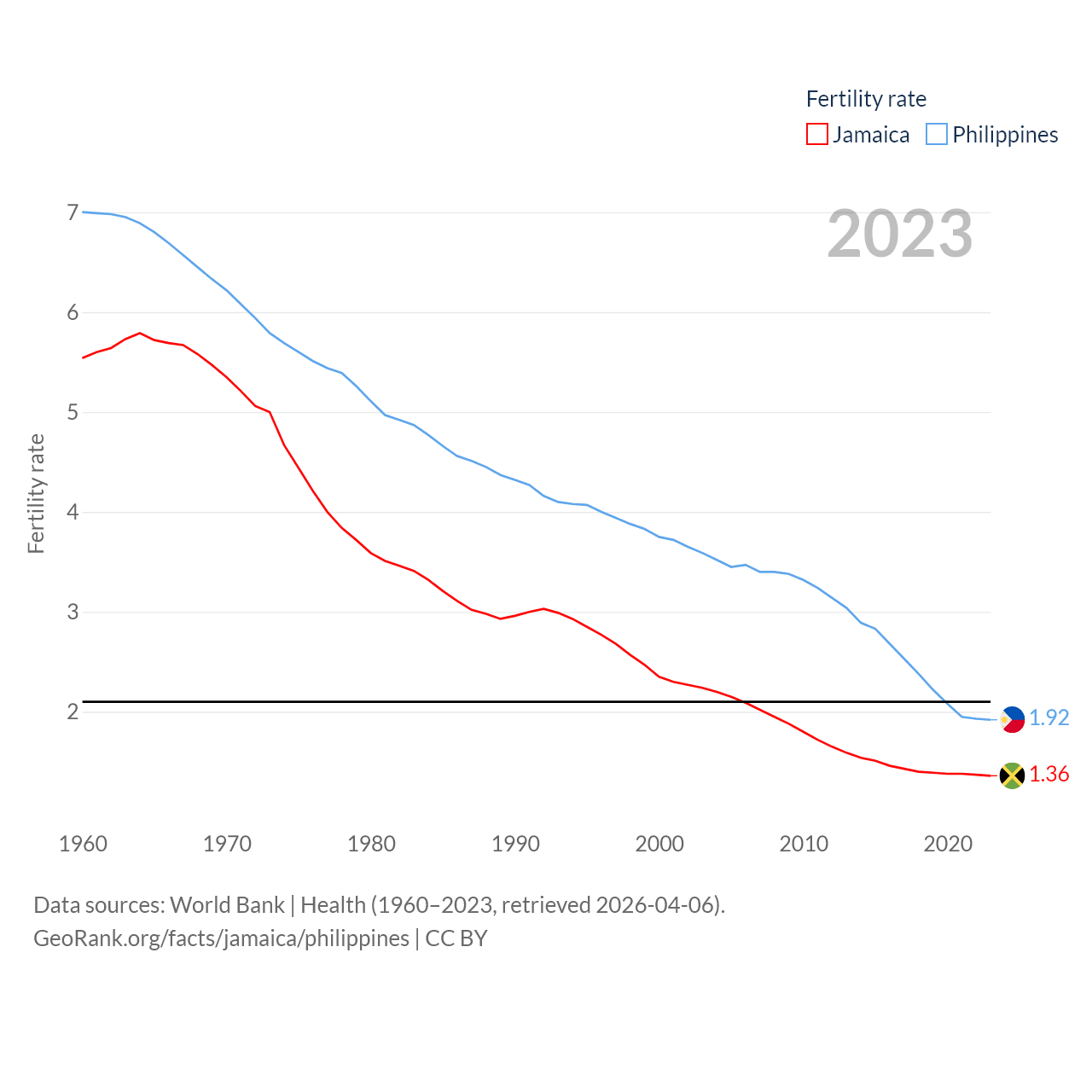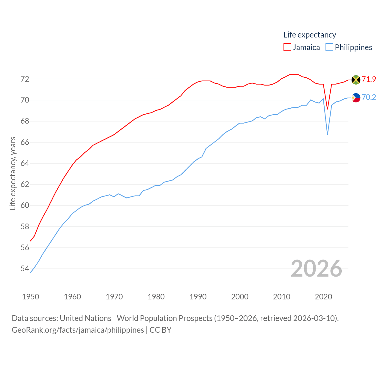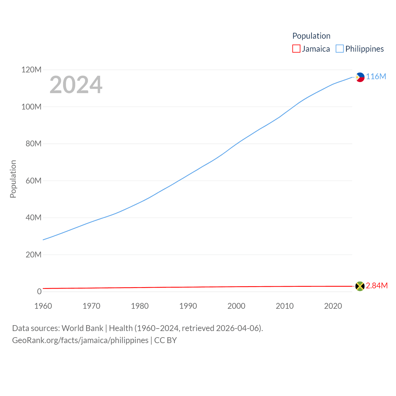 Jamaica has a population of 2.84M (ranked 139/197), compared with 116M in The Philippines (ranked 14/197). Jamaica's land area is 4,181 sq mi versus 115,124 sq mi for The Philippines (ranked 159th vs. 71st).