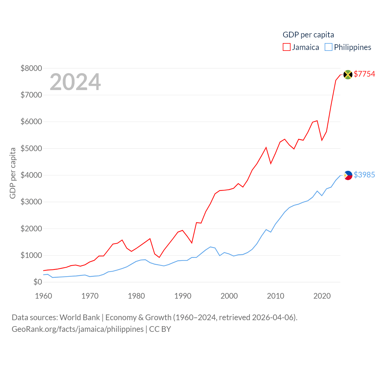 By GDP, Jamaica ranks 124/197 ($22B) and The Philippines ranks 35/197 ($462B). By GDP per capita, Jamaica ranks 95/197 ($7,754), while The Philippines ranks 130/197 ($3,985).
