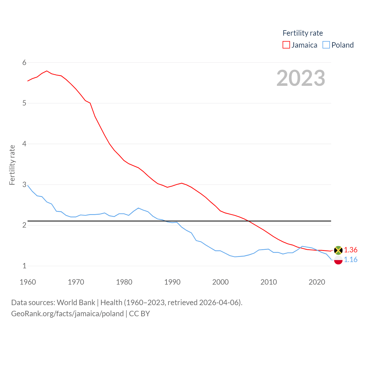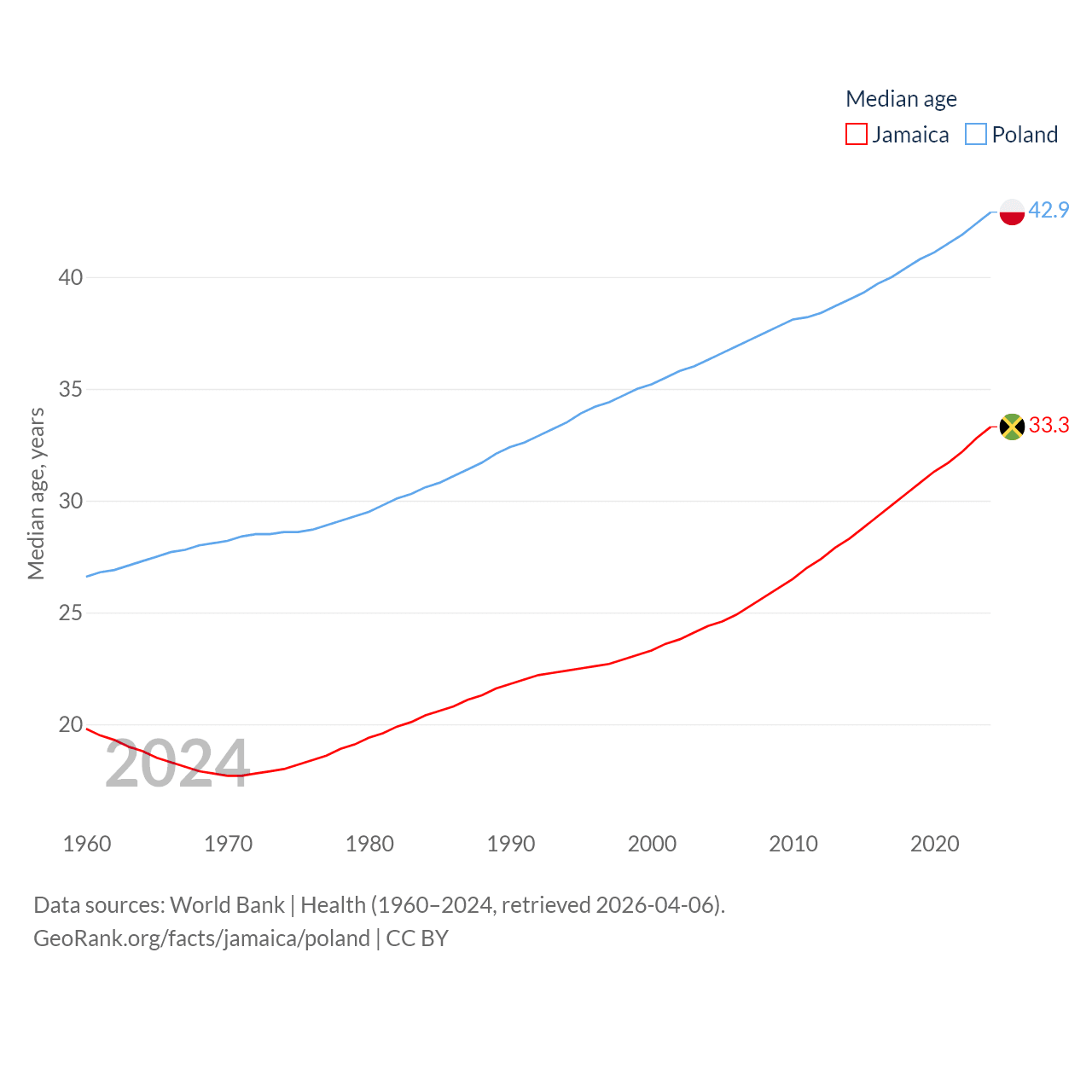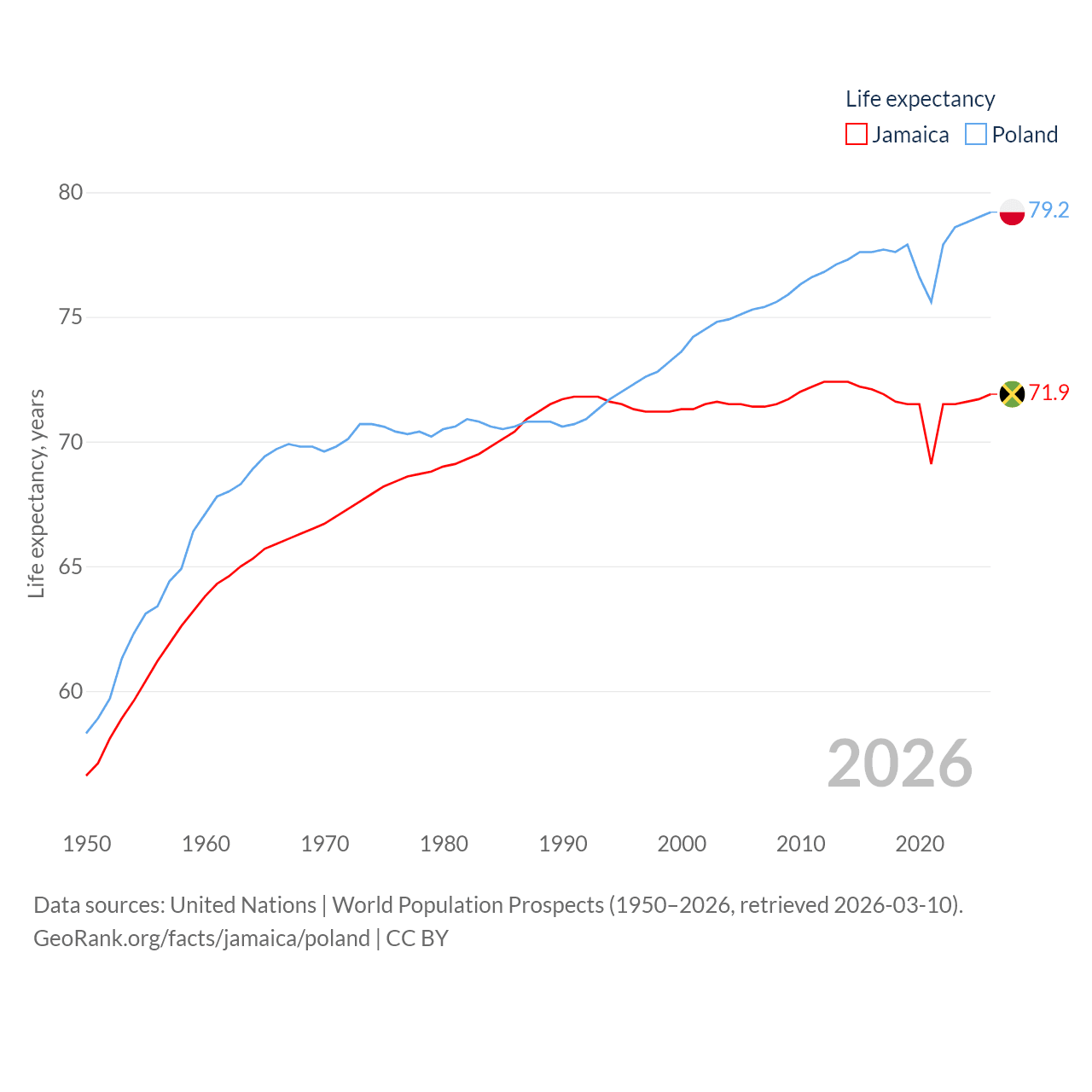 Jamaica has a population of 2.84M (ranked 139/197), compared with 36.6M in Poland (ranked 42/197). Jamaica's land area is 4,181 sq mi versus 118,252 sq mi for Poland (ranked 159th vs. 69th).