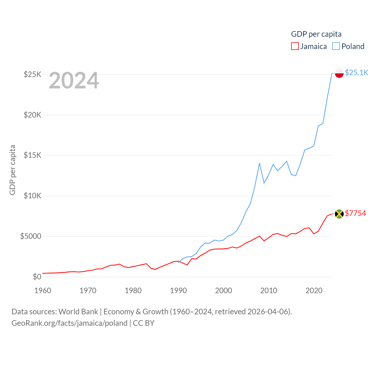 By GDP, Jamaica ranks 124/197 ($22B) and Poland ranks 21/197 ($918B). By GDP per capita, Jamaica ranks 95/197 ($7,754), while Poland ranks 48/197 ($25,104).