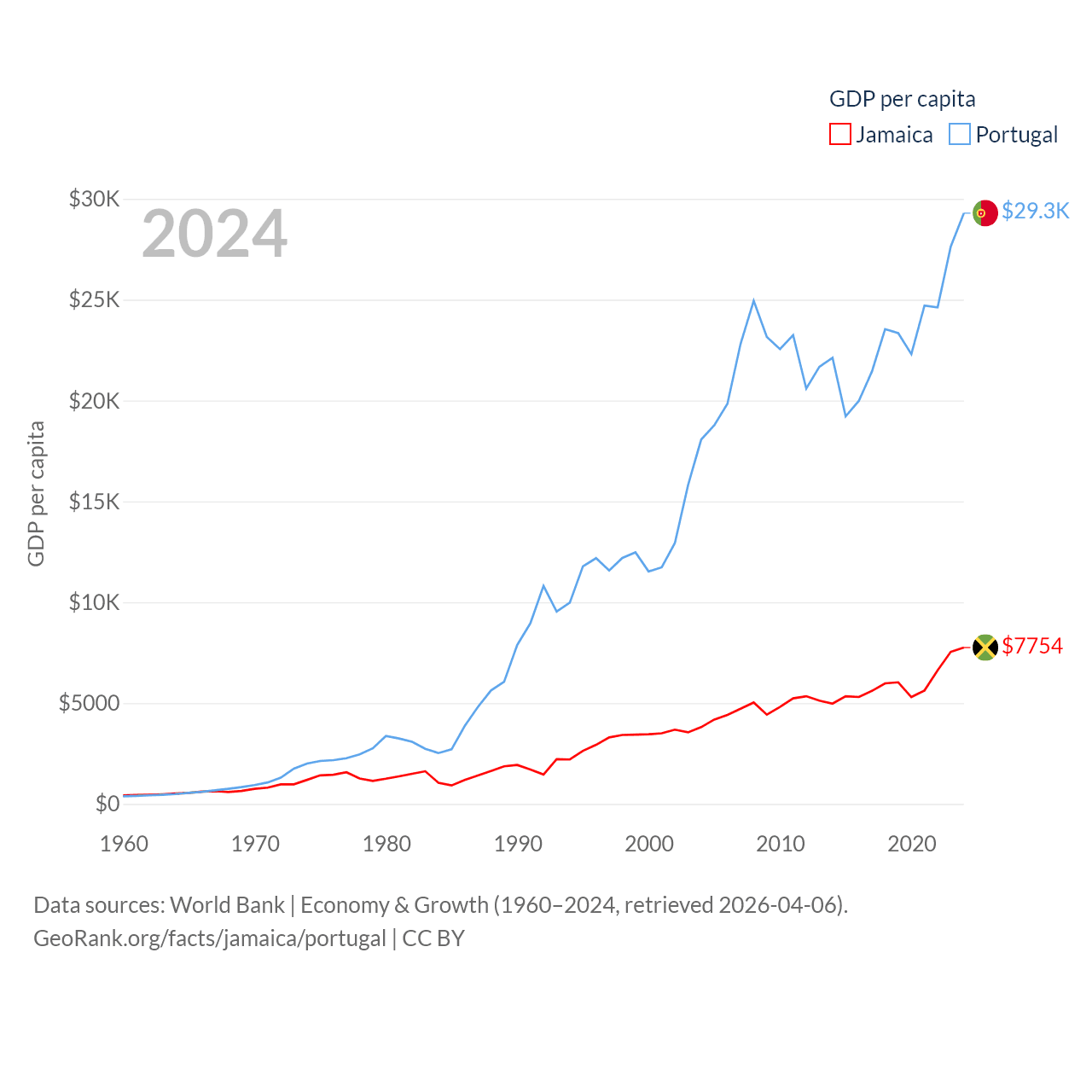 By GDP, Jamaica ranks 124/197 ($22B) and Portugal ranks 46/197 ($313B). By GDP per capita, Jamaica ranks 95/197 ($7,754), while Portugal ranks 44/197 ($29,292).