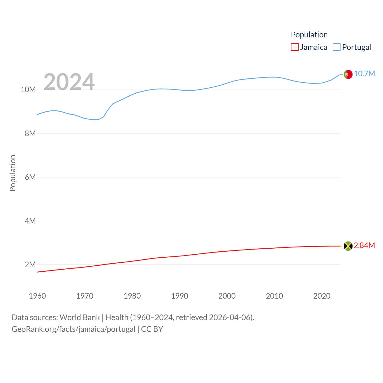 Jamaica has a population of 2.84M (ranked 139/197), compared with 10.7M in Portugal (ranked 90/197). Jamaica's land area is 4,181 sq mi versus 35,369 sq mi for Portugal (ranked 159th vs. 108th).