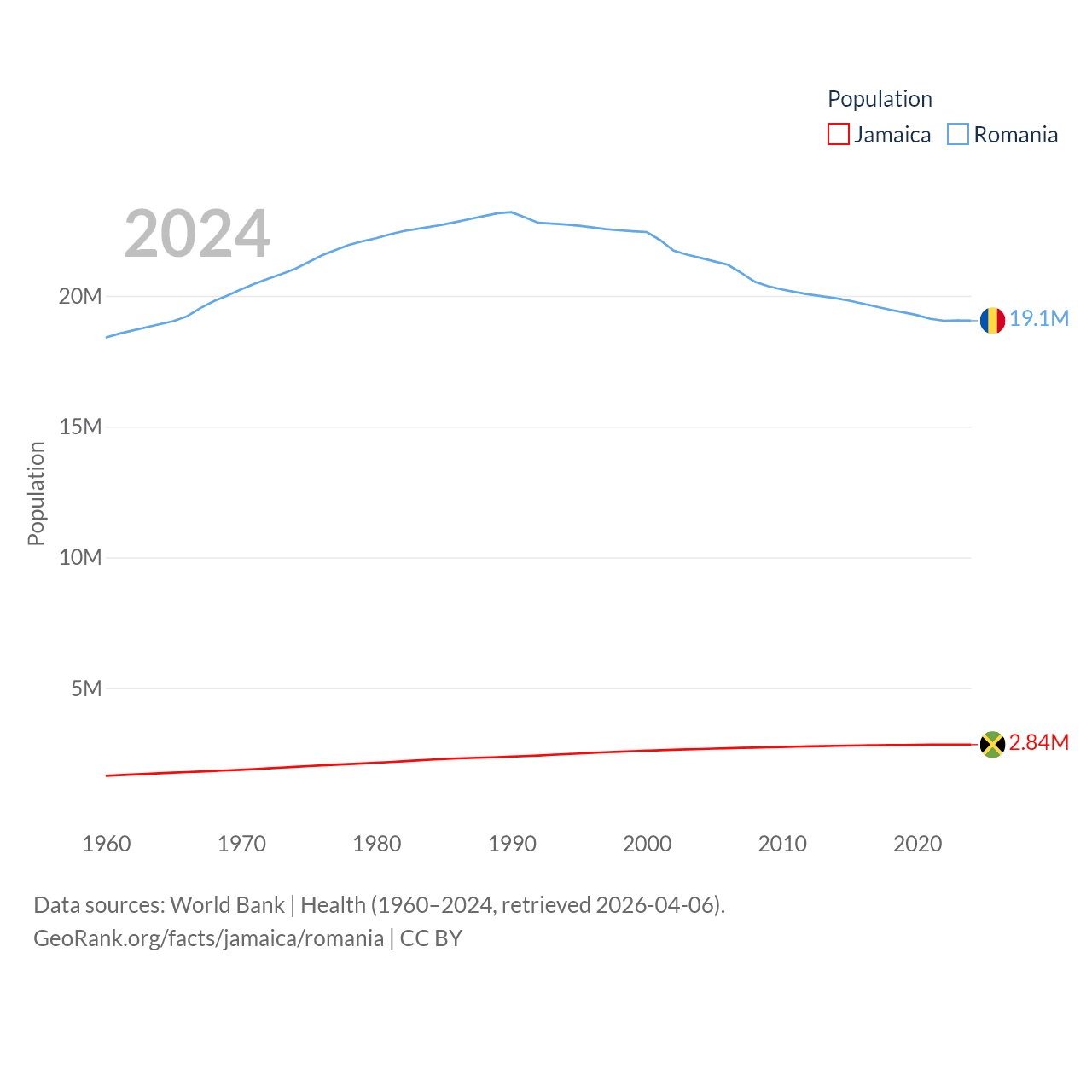 Jamaica has a population of 2.84M (ranked 139/197), compared with 19.1M in Romania (ranked 67/197). Jamaica's land area is 4,181 sq mi versus 88,834 sq mi for Romania (ranked 159th vs. 80th).