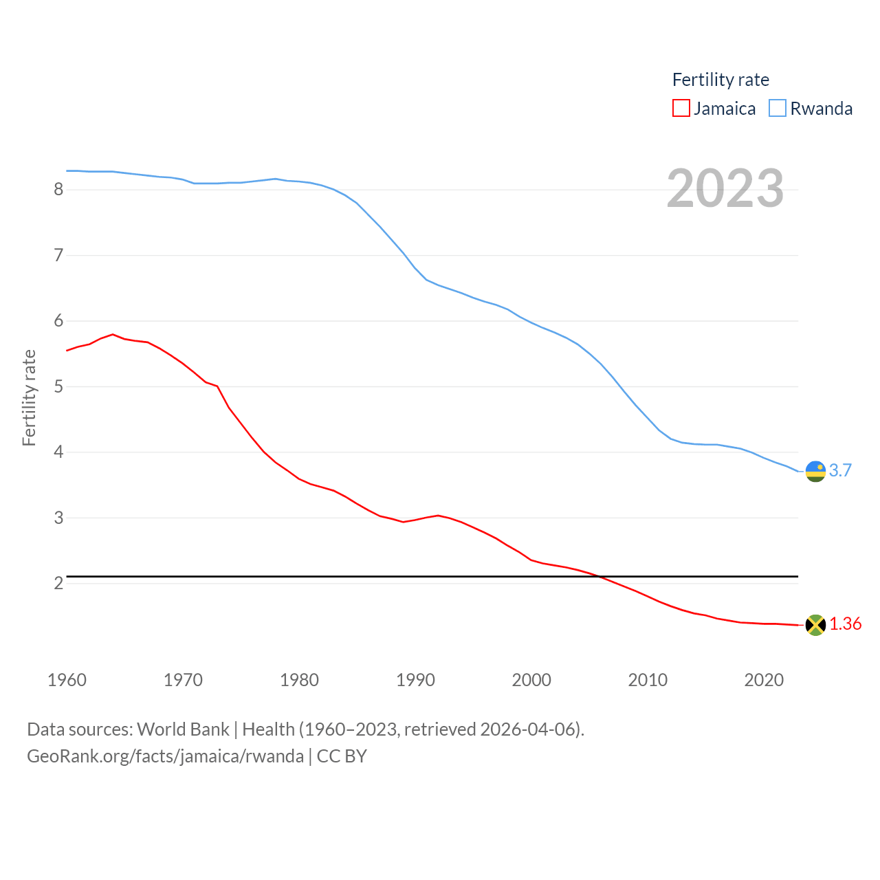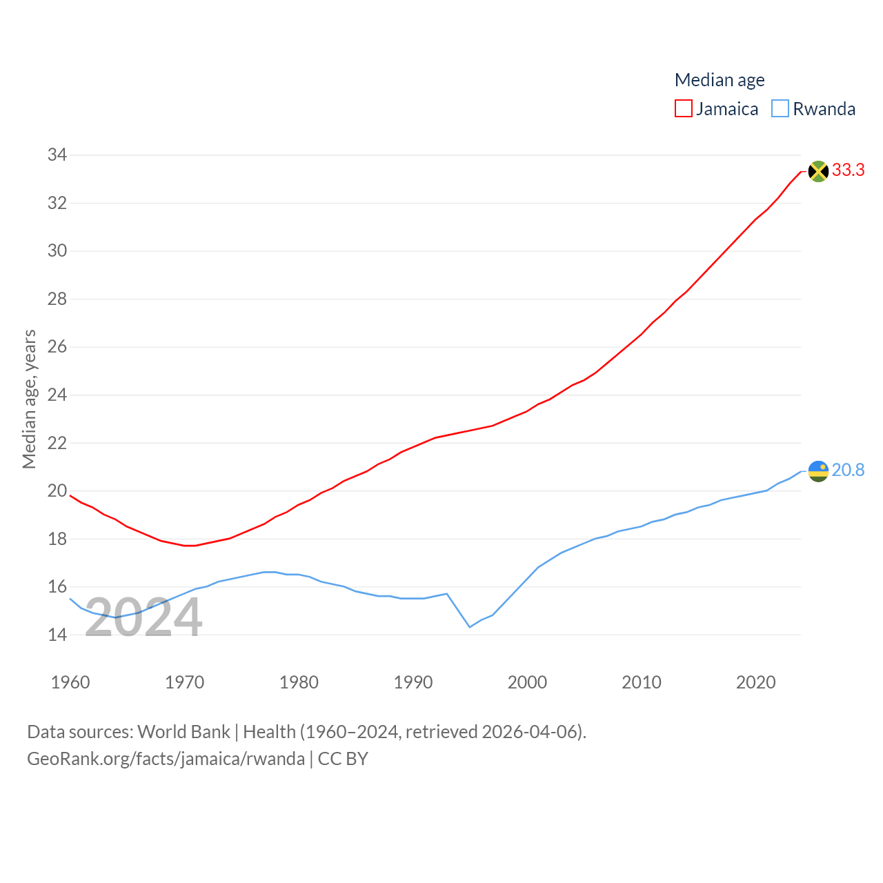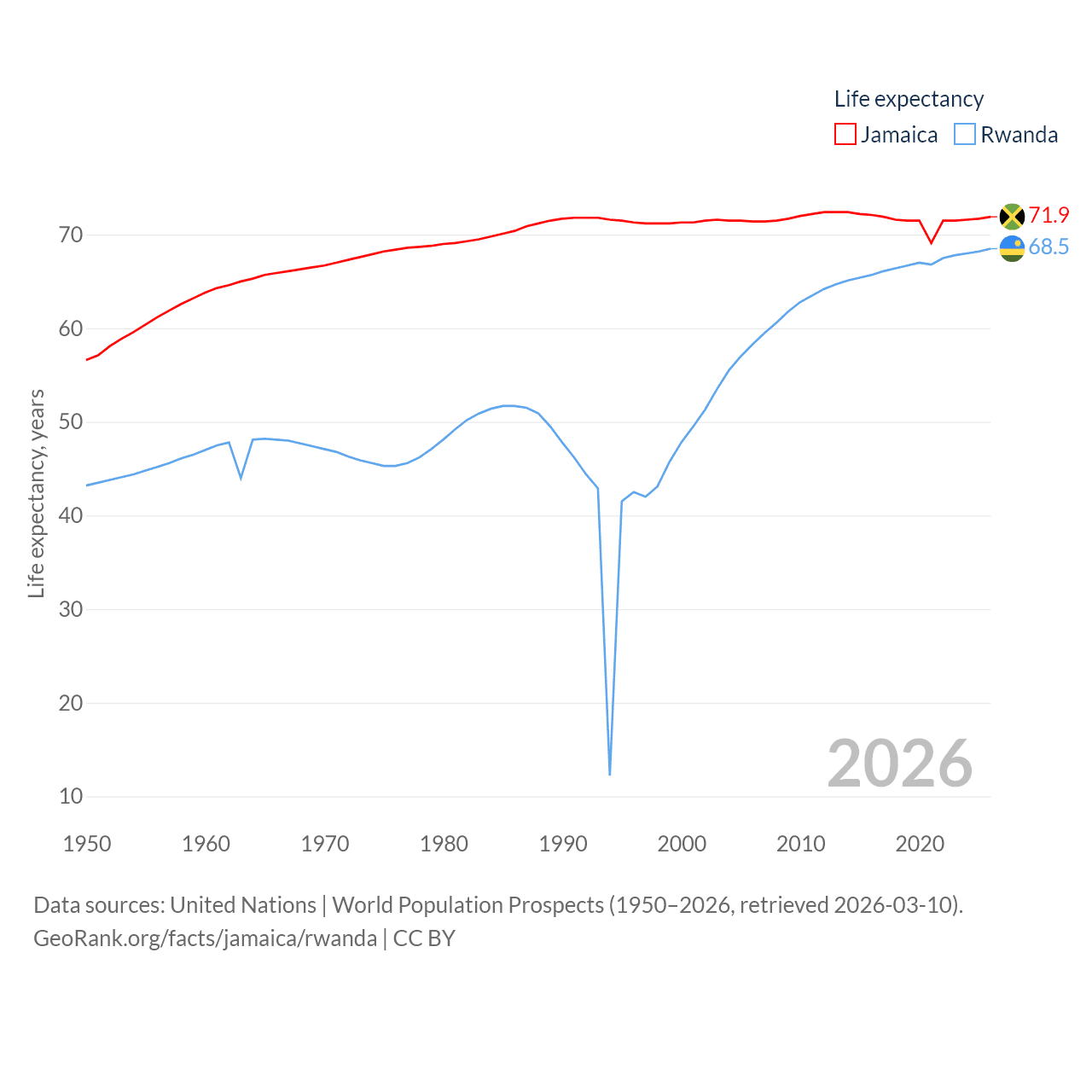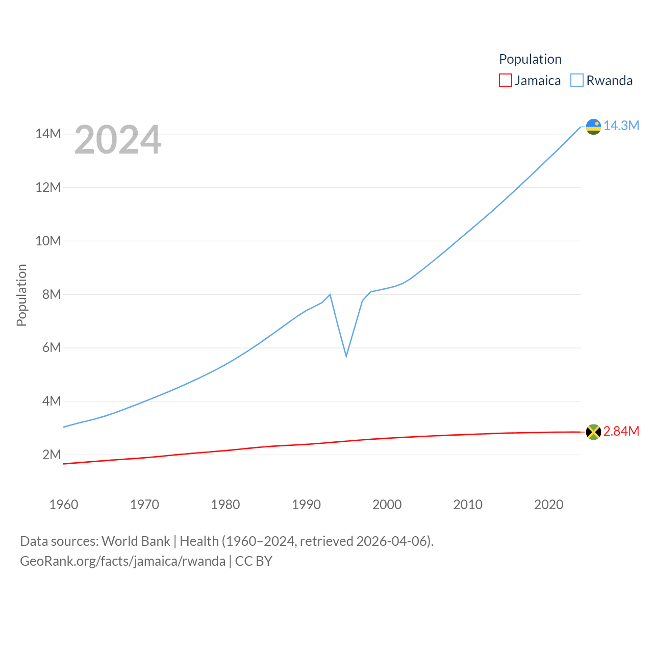 Jamaica has a population of 2.84M (ranked 139/197), compared with 14.3M in Rwanda (ranked 77/197). Jamaica's land area is 4,181 sq mi versus 9,525 sq mi for Rwanda (ranked 159th vs. 146th).