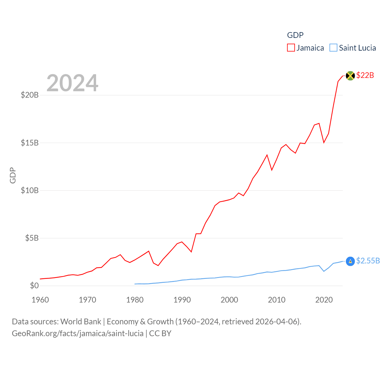 By GDP, Jamaica ranks 124/197 ($22B) and Saint Lucia ranks 173/197 ($2.55B). By GDP per capita, Jamaica ranks 95/197 ($7,754), while Saint Lucia ranks 70/197 ($14,182).