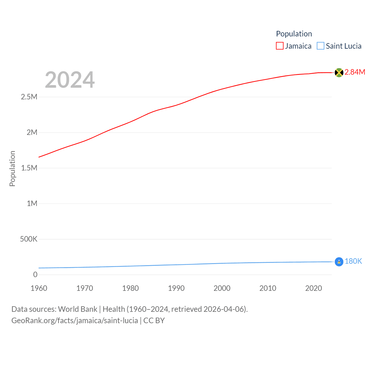 Jamaica has a population of 2.84M (ranked 139/197), compared with 180K in Saint Lucia (ranked 178/197). Jamaica's land area is 4,181 sq mi versus 235.5 sq mi for Saint Lucia (ranked 159th vs. 178th).