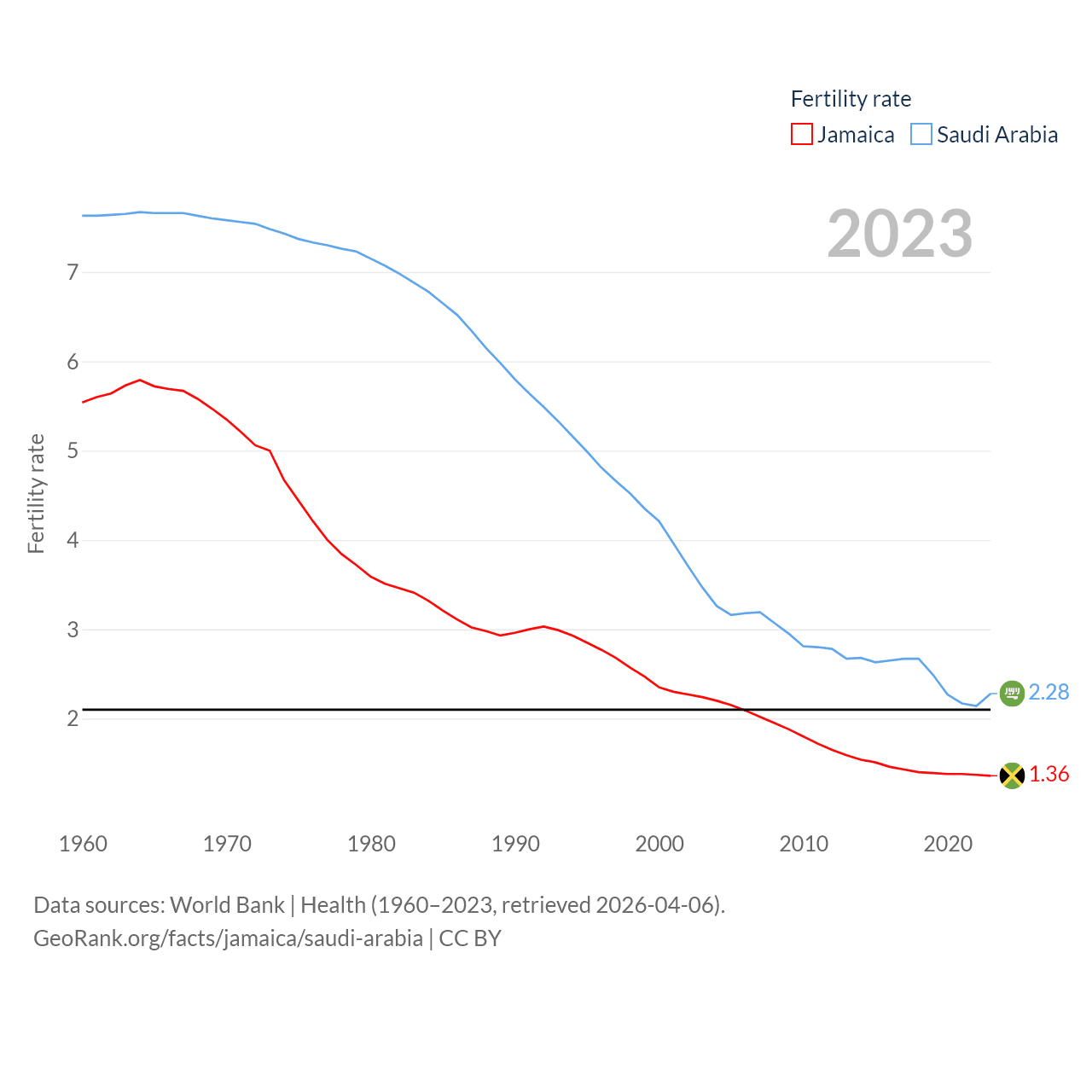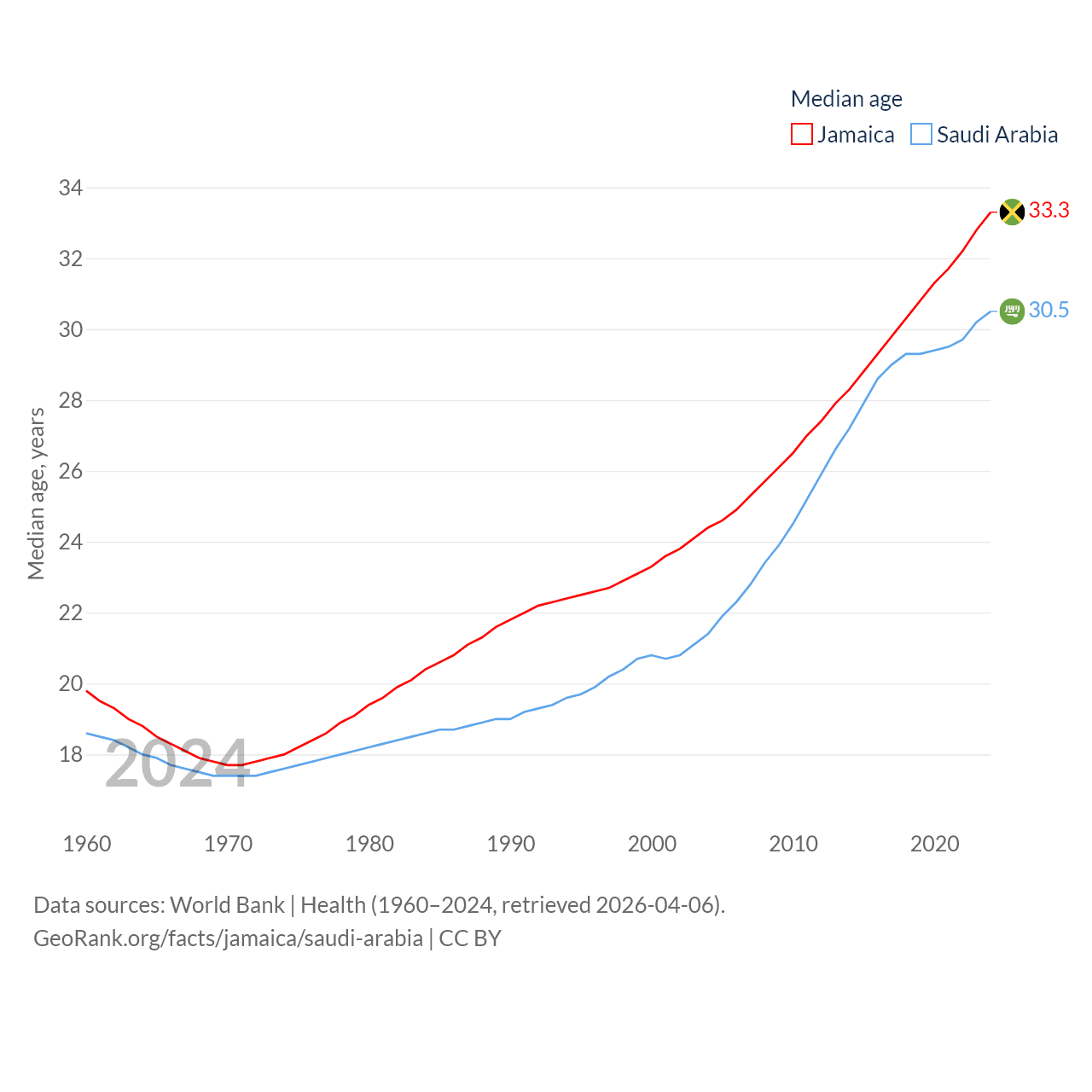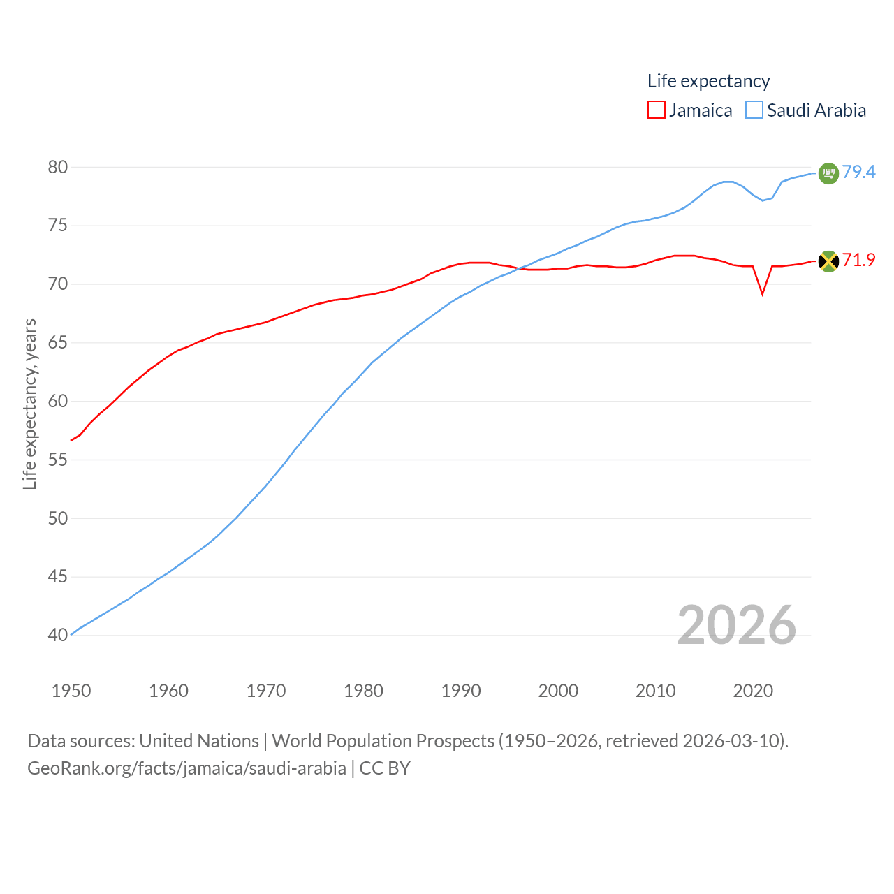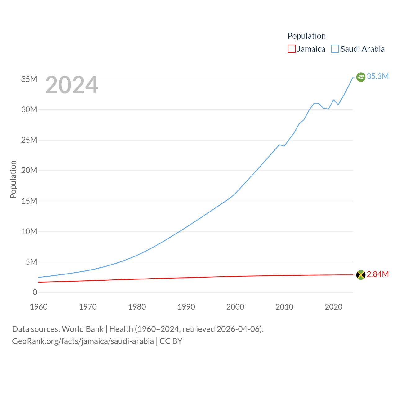 Jamaica has a population of 2.84M (ranked 139/197), compared with 35.3M in Saudi Arabia (ranked 45/197). Jamaica's land area is 4,181 sq mi versus 830,000 sq mi for Saudi Arabia (ranked 159th vs. 12th).