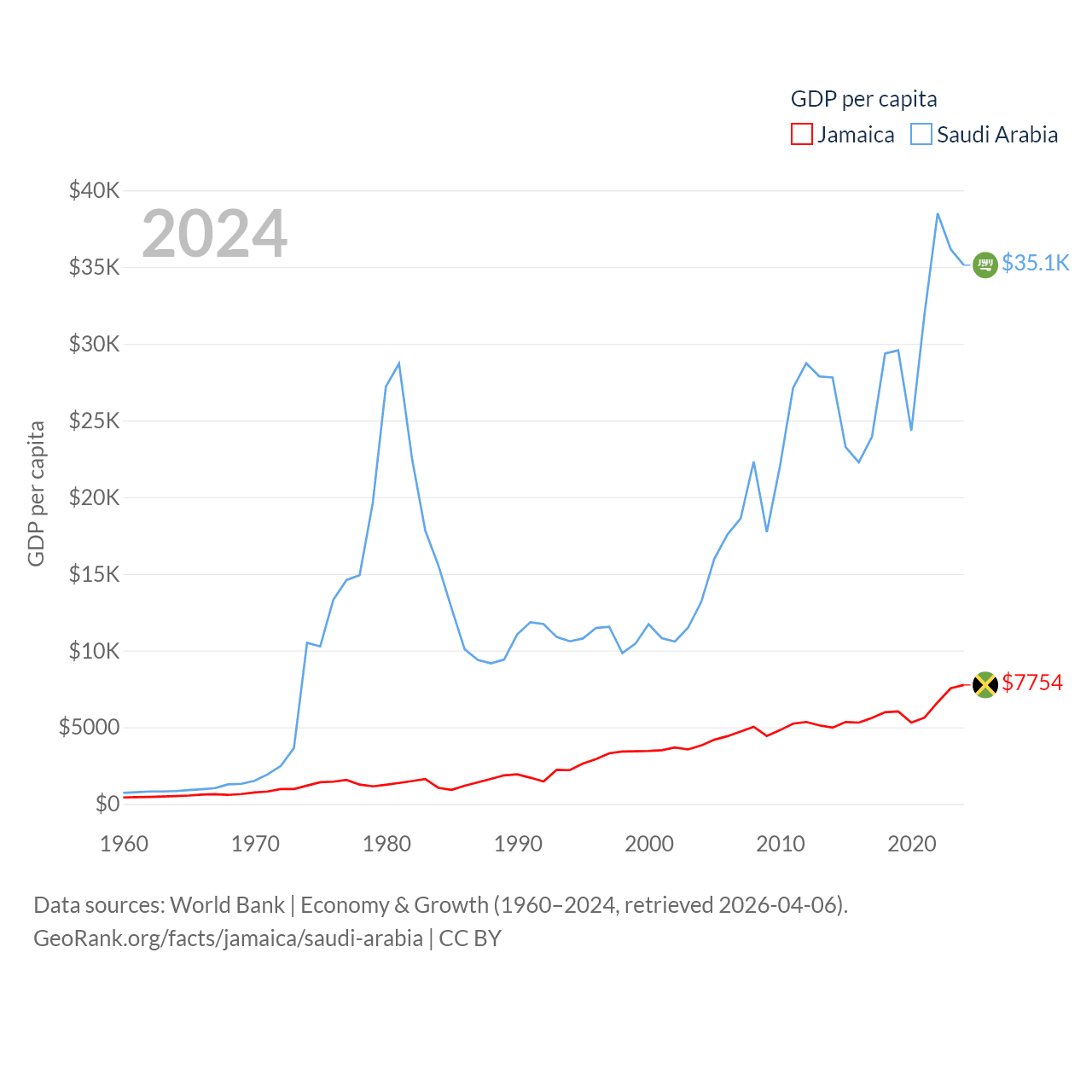 By GDP, Jamaica ranks 124/197 ($22B) and Saudi Arabia ranks 18/197 ($1.24T). By GDP per capita, Jamaica ranks 95/197 ($7,754), while Saudi Arabia ranks 33/197 ($35,122).