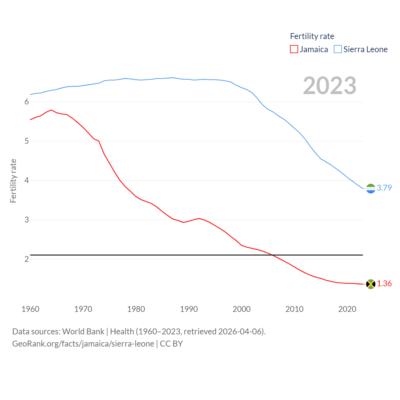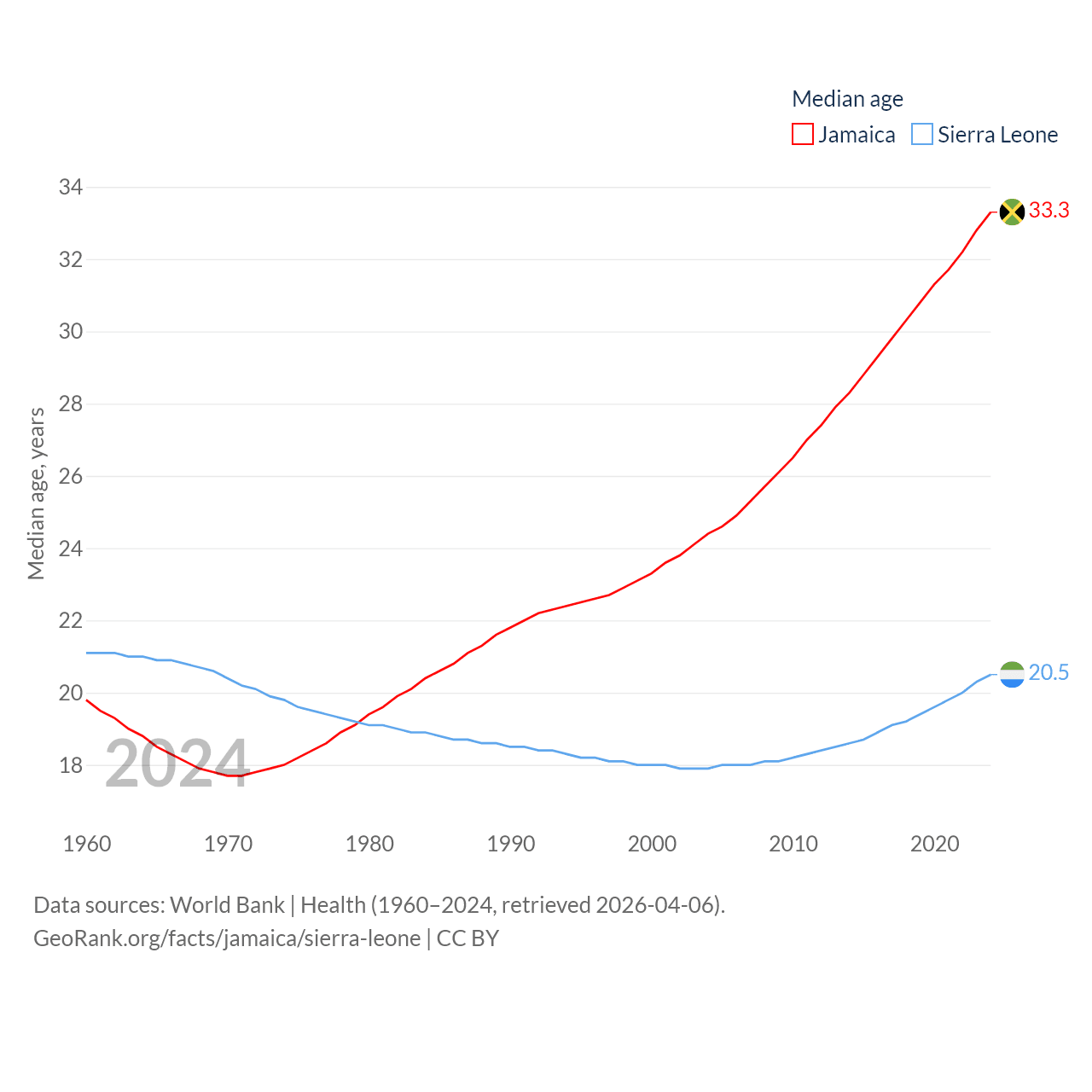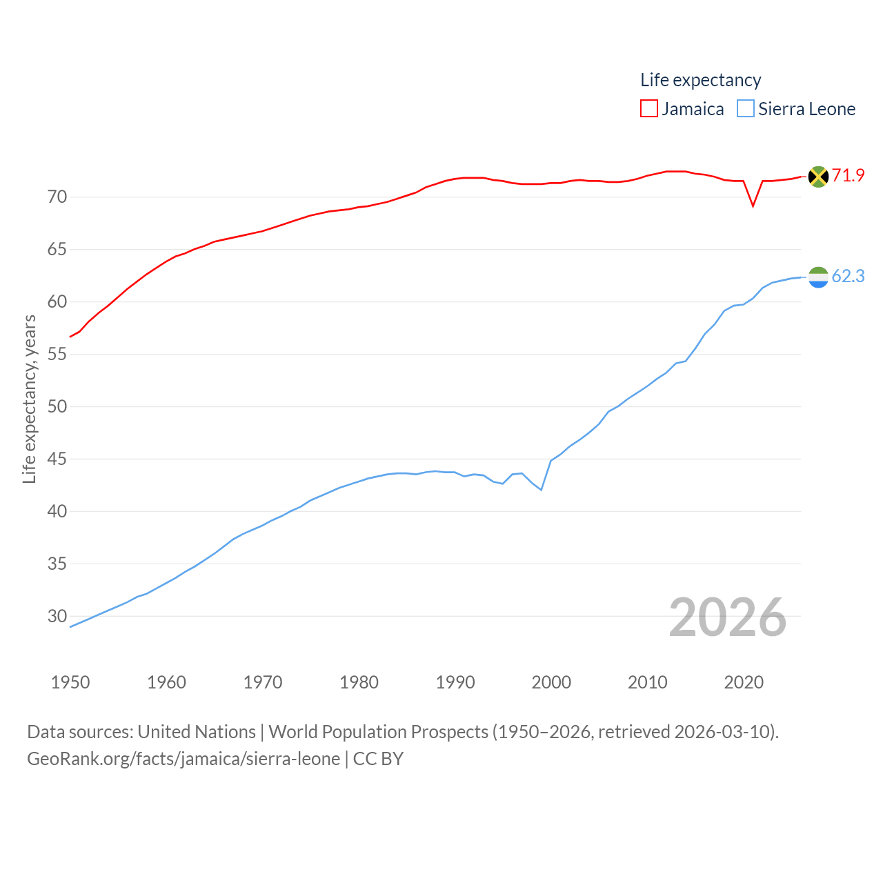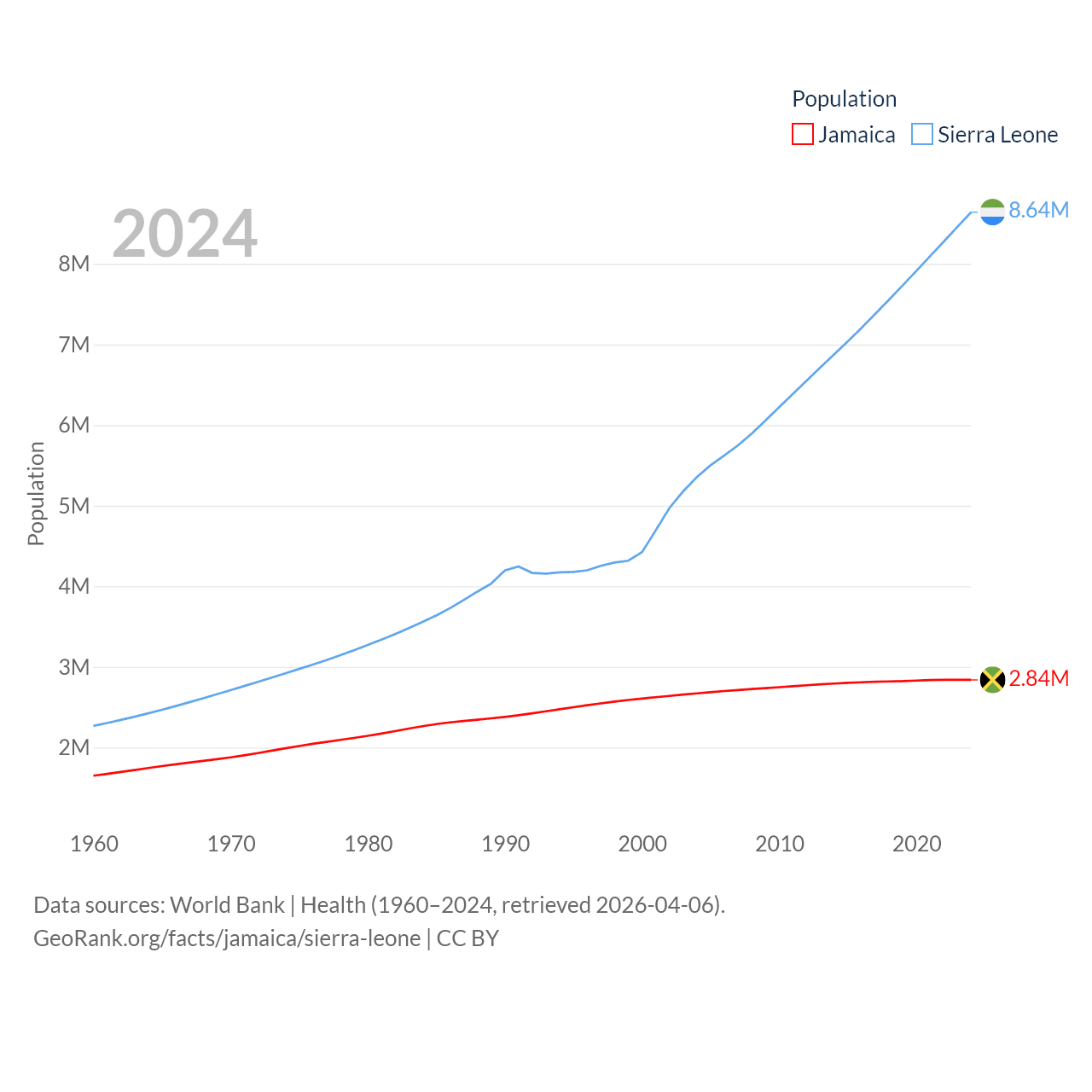 Jamaica has a population of 2.84M (ranked 139/197), compared with 8.64M in Sierra Leone (ranked 102/197). Jamaica's land area is 4,181 sq mi versus 27,869 sq mi for Sierra Leone (ranked 159th vs. 116th).