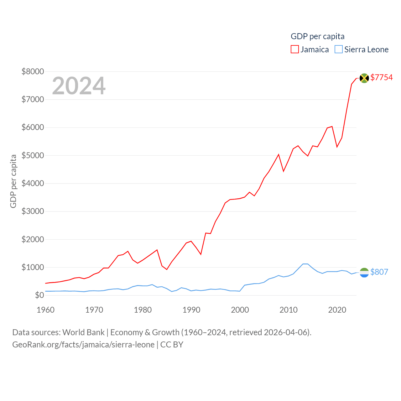 By GDP, Jamaica ranks 124/197 ($22B) and Sierra Leone ranks 160/197 ($6.97B). By GDP per capita, Jamaica ranks 95/197 ($7,754), while Sierra Leone ranks 186/197 ($807).